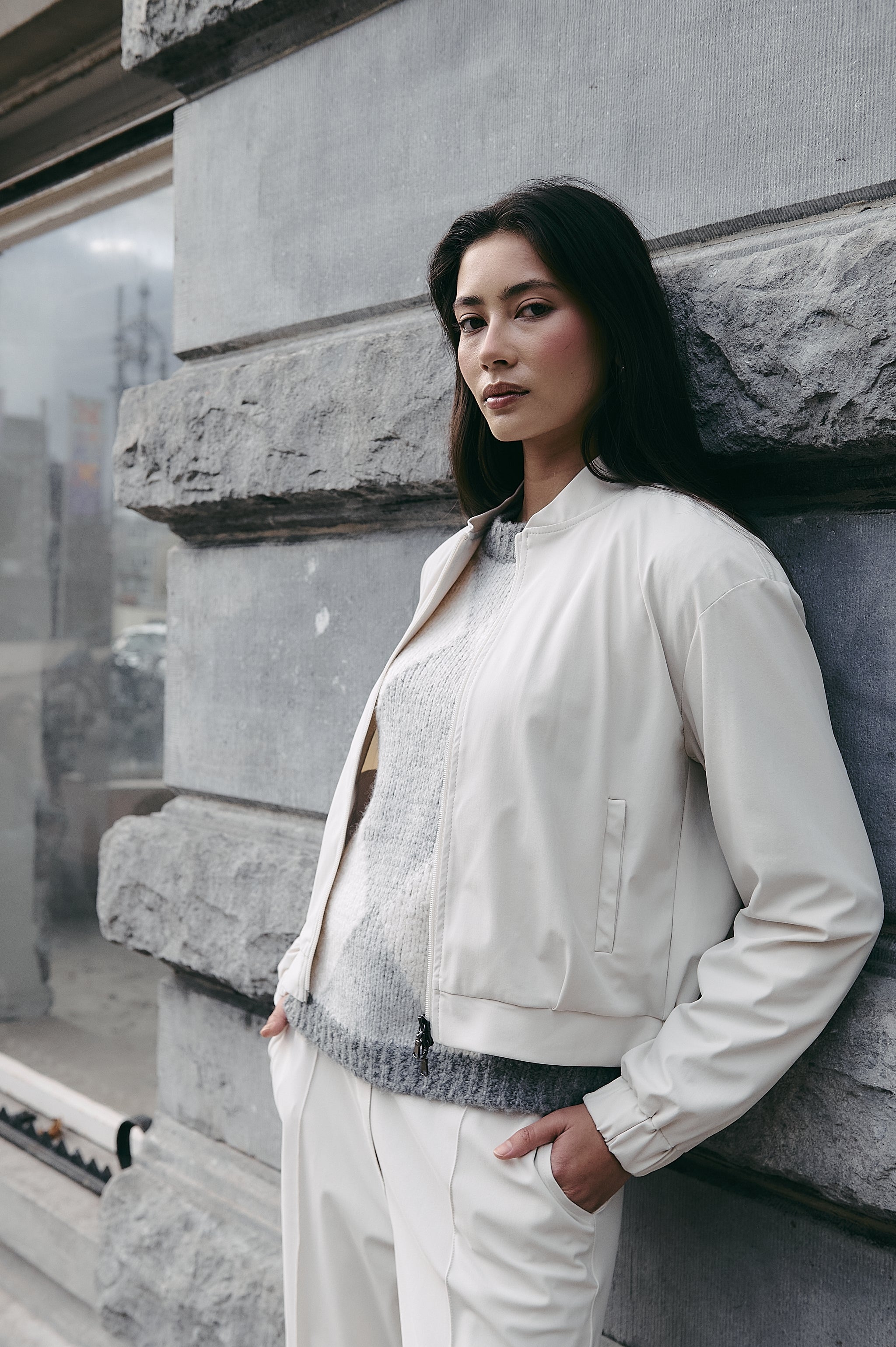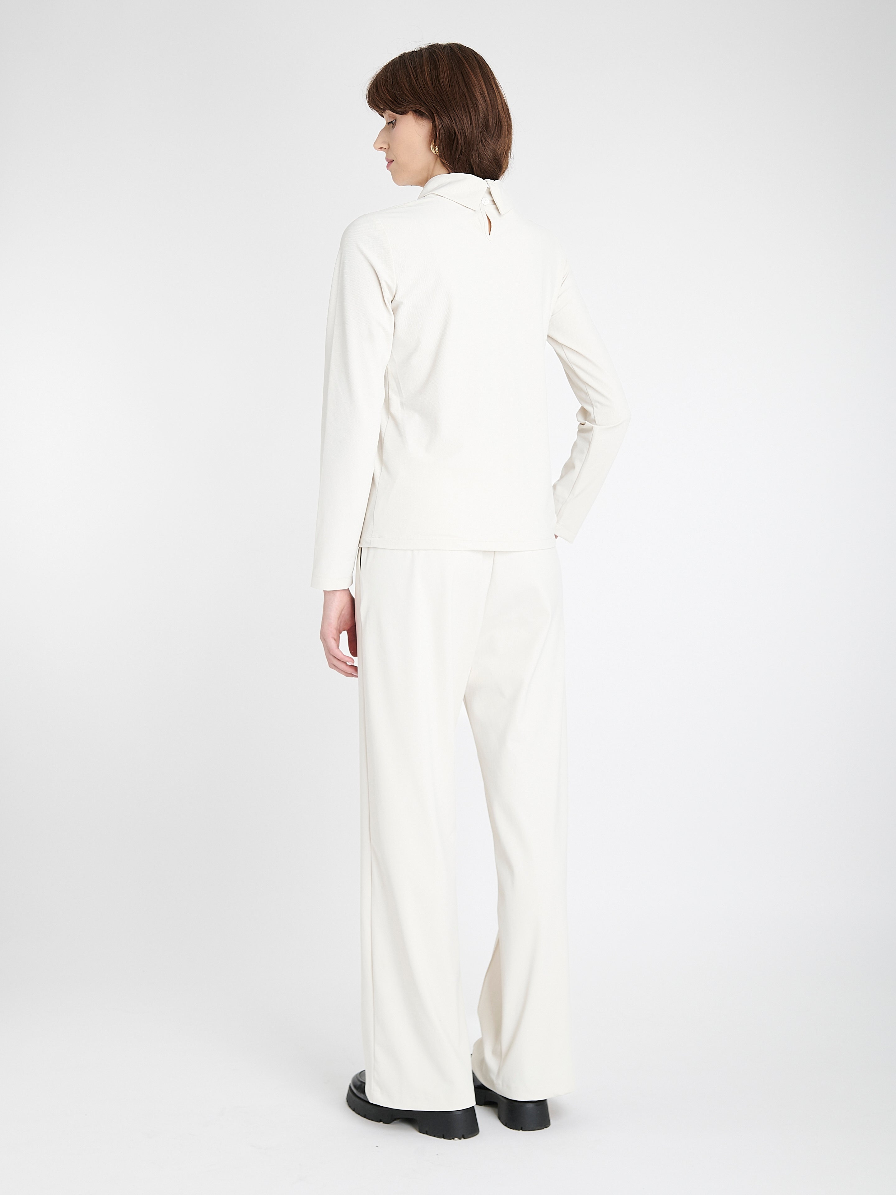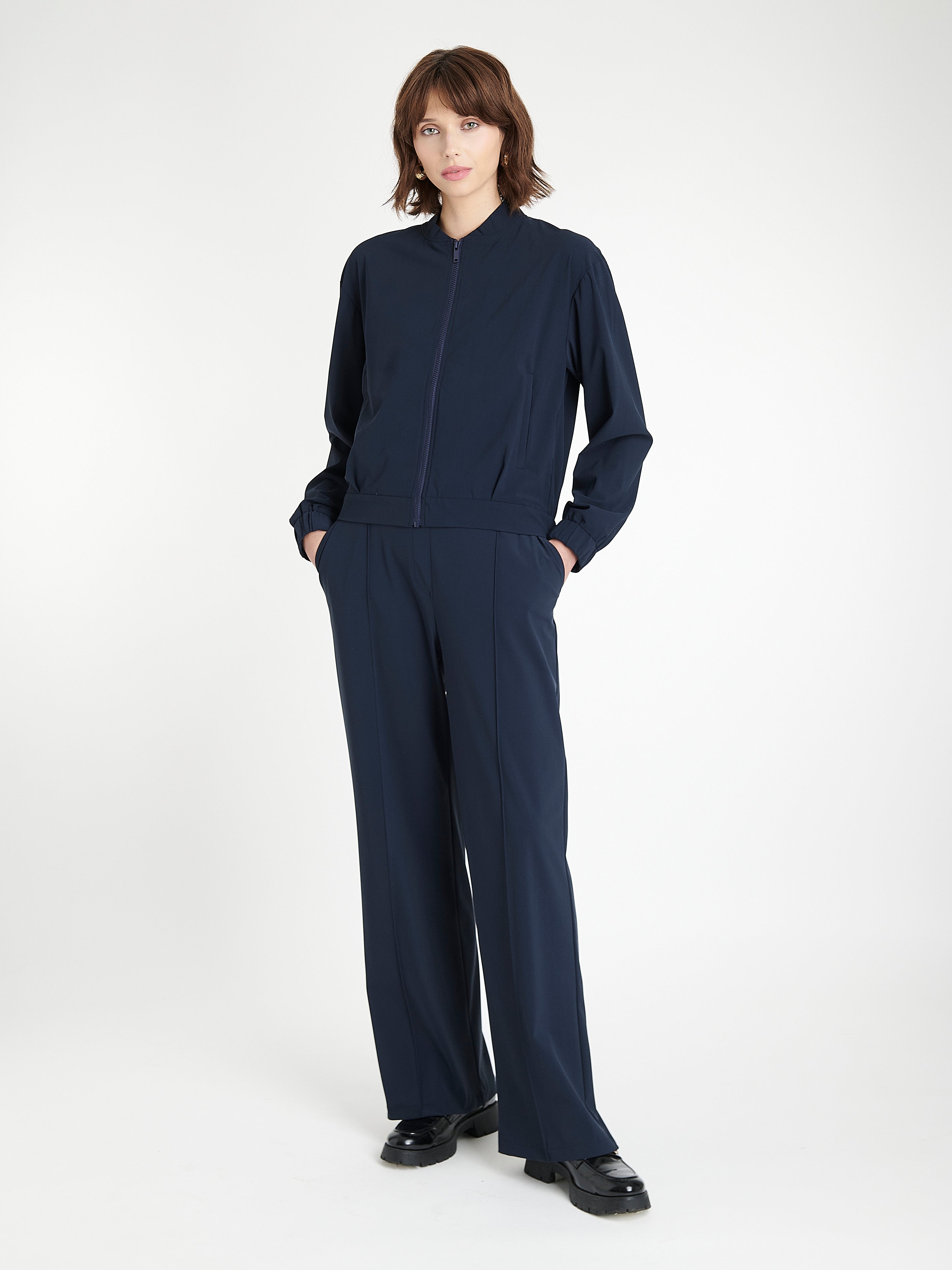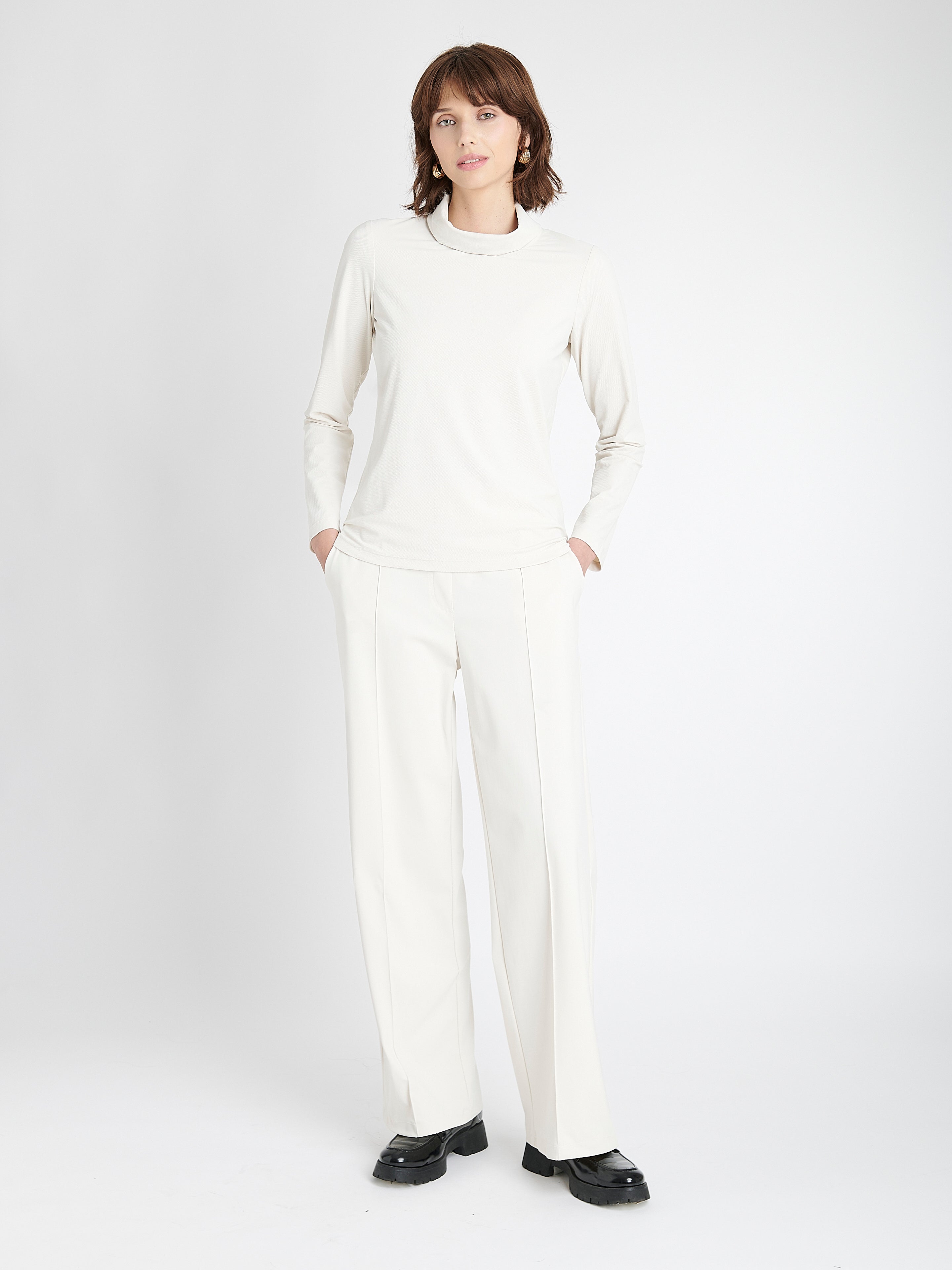 Eleganti e funzionali, i pantaloni Thera offrono una silhouette pulita con dettagli sartoriali. Realizzati in jersey tecnico spazzolato, risultano morbidi sulla pelle e forniscono una struttura delicata. La gamba larga con piega stirata dona un look raffinato, mentre la vita media garantisce comfort quotidiano – perfetti per l’ufficio o le occasioni formali.