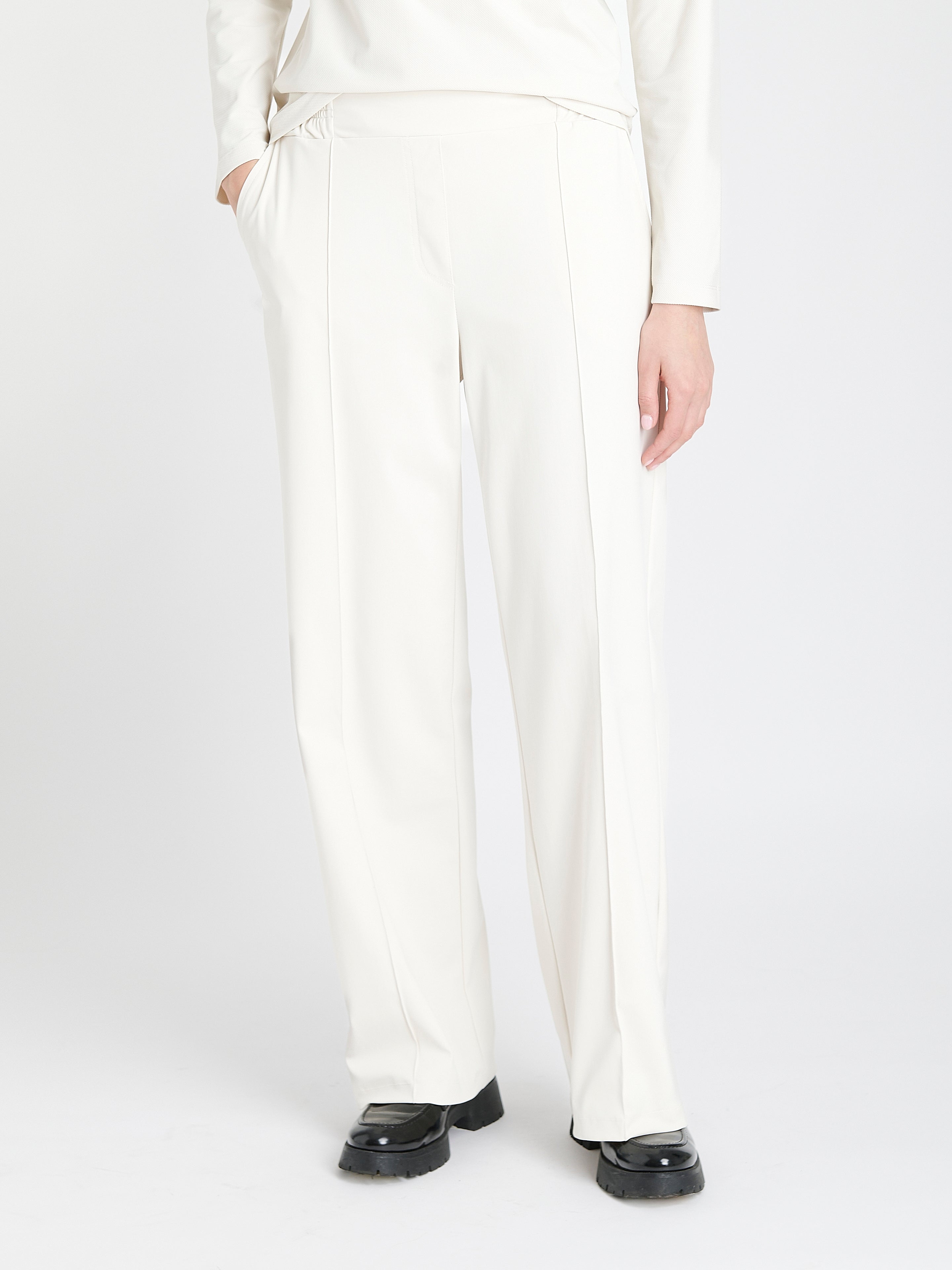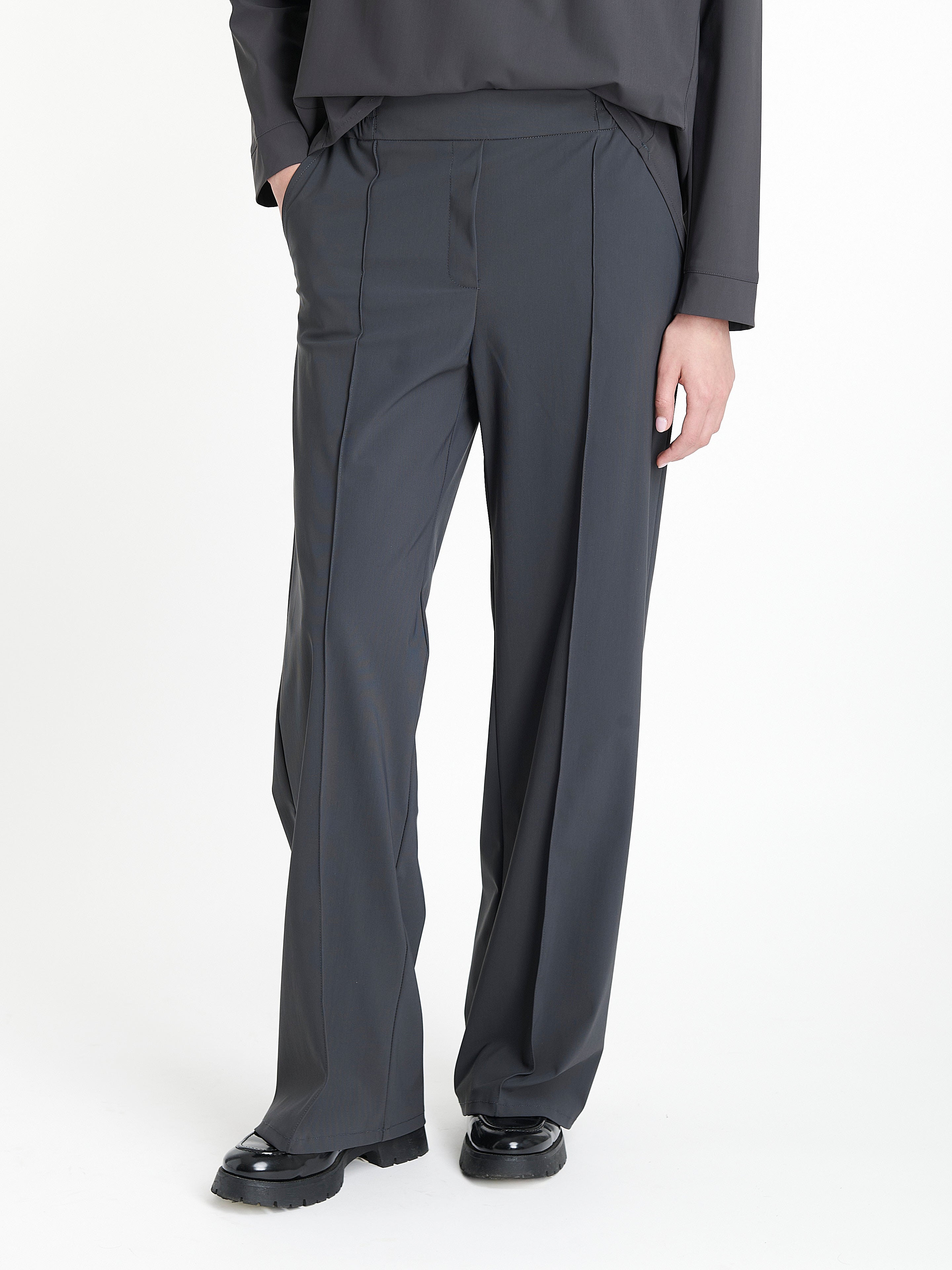 Pantaloni Thea: Lasciatevi conquistare dal fascino sofisticato dei pantaloni Thea della nostra collezione. Con gambe larghe e minuziose pieghe frontali, questi pantaloni mostrano un'armoniosa miscela di modernità ed eleganza classica. Realizzati in jersey high-tech, offrono comfort senza compromettere lo stile.