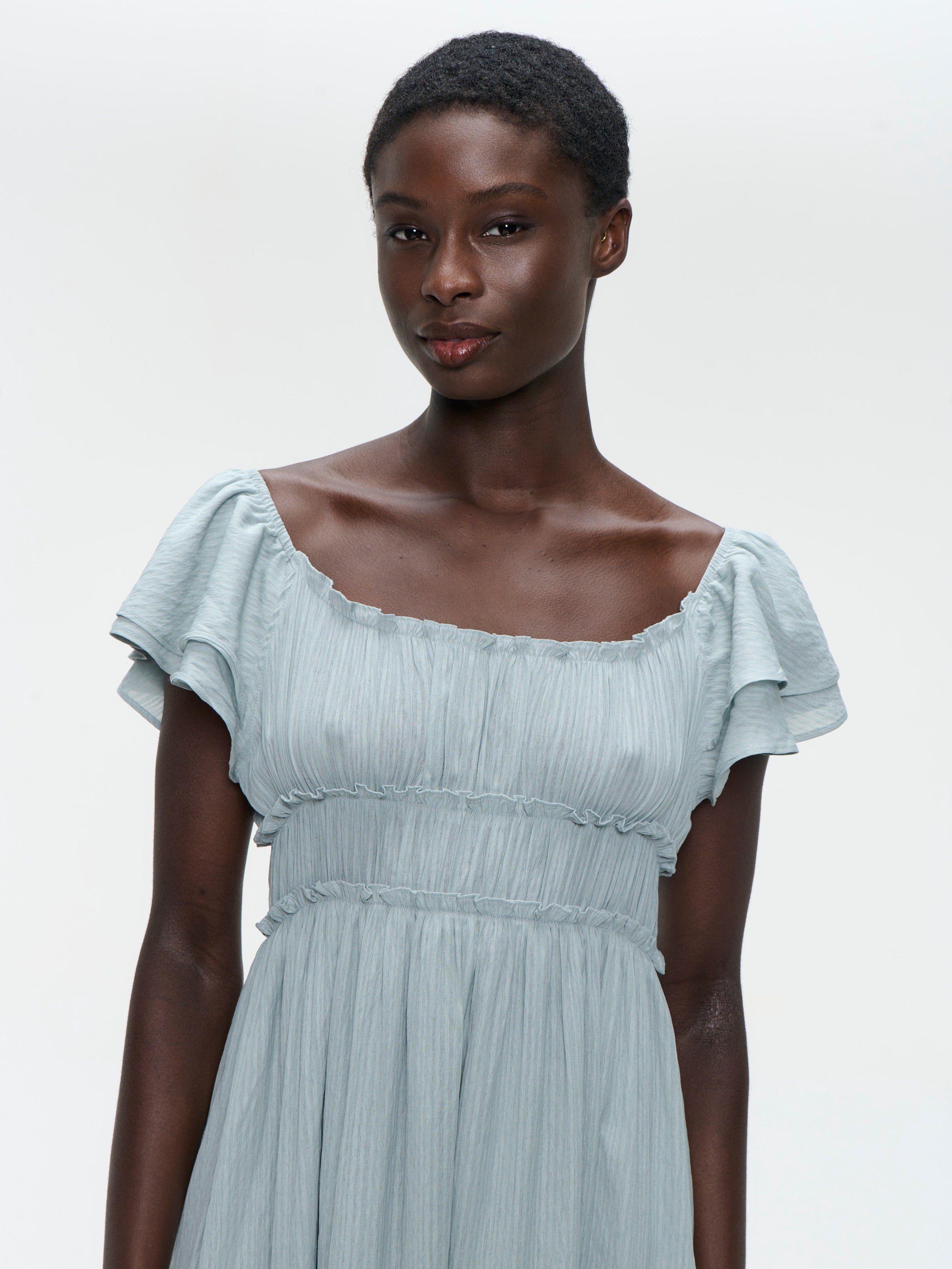 • Maniche a sbuffo e scollo quadrato