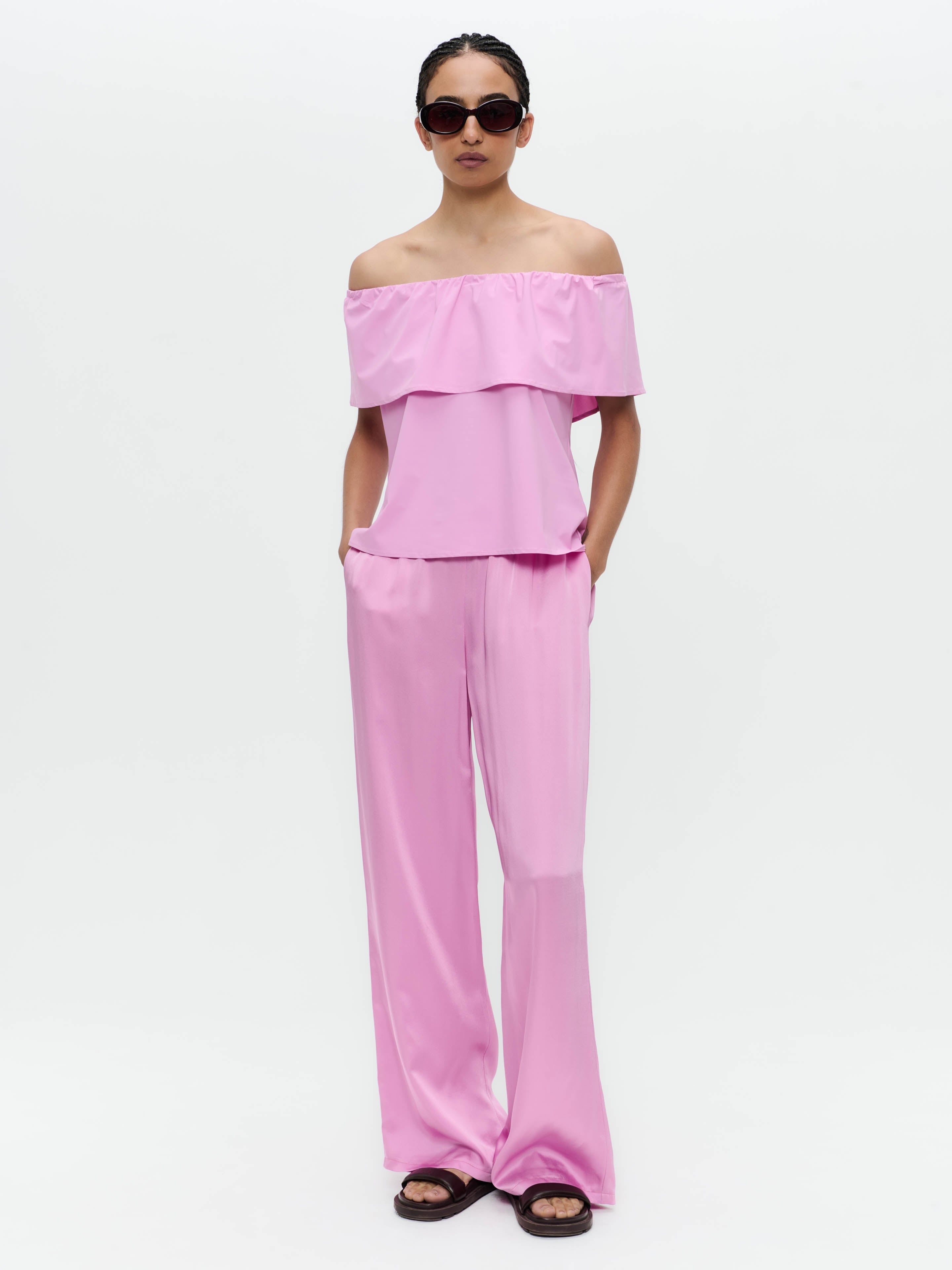 Top in cotone Diane: Elevate il vostro stile estivo con il top Diane. Caratterizzato da un elegante design off-the-shoulder e da una vistosa scollatura a volant, questo top è allo stesso tempo chic e comodo. Realizzato in leggero jersay tecnico, è perfetto per le occasioni più calde, sia che vogliate vestirvi bene per una serata fuori, sia che vogliate mantenervi casual durante il giorno. Un must versatile per una raffinatezza senza sforzo.