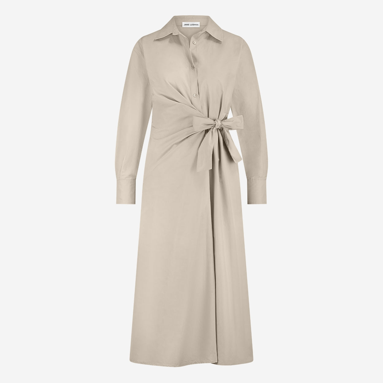 L’abito Edyta Taffeta unisce l’eleganza classica dell’abito camicia a dettagli scultorei moderni. Realizzato in taffetà di cotone misto, presenta un colletto camicia, una chiusura con bottoni nascosti e un dettaglio asimmetrico a torsione che crea un drappeggio valorizzante in vita. La lunghezza midi e le maniche lunghe lo rendono versatile per ufficio e serate.