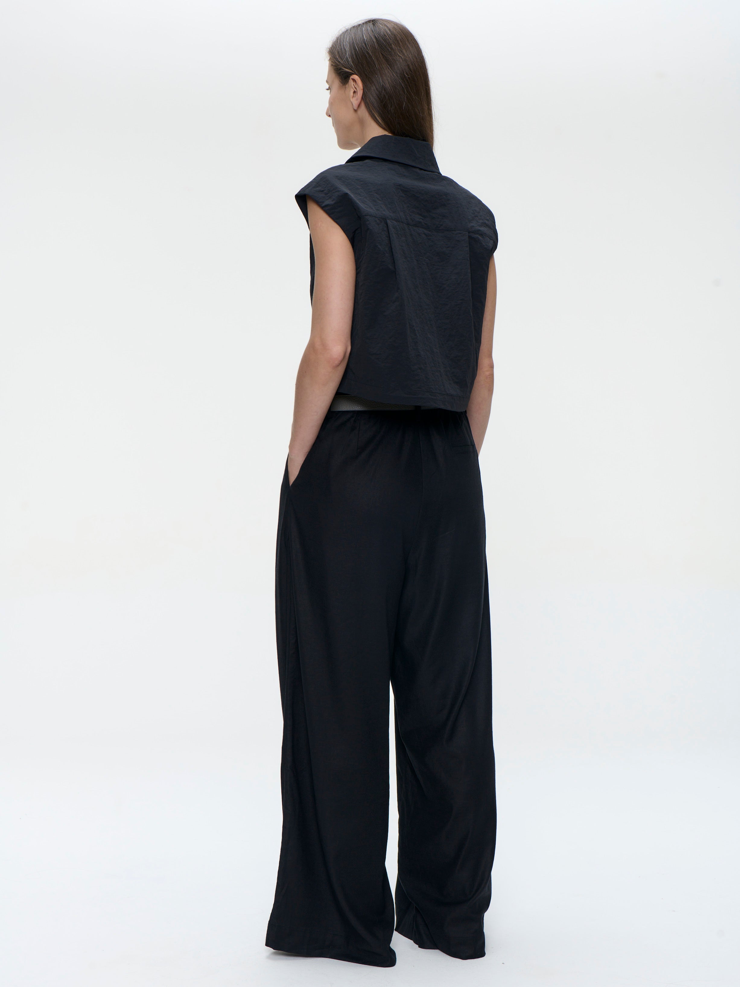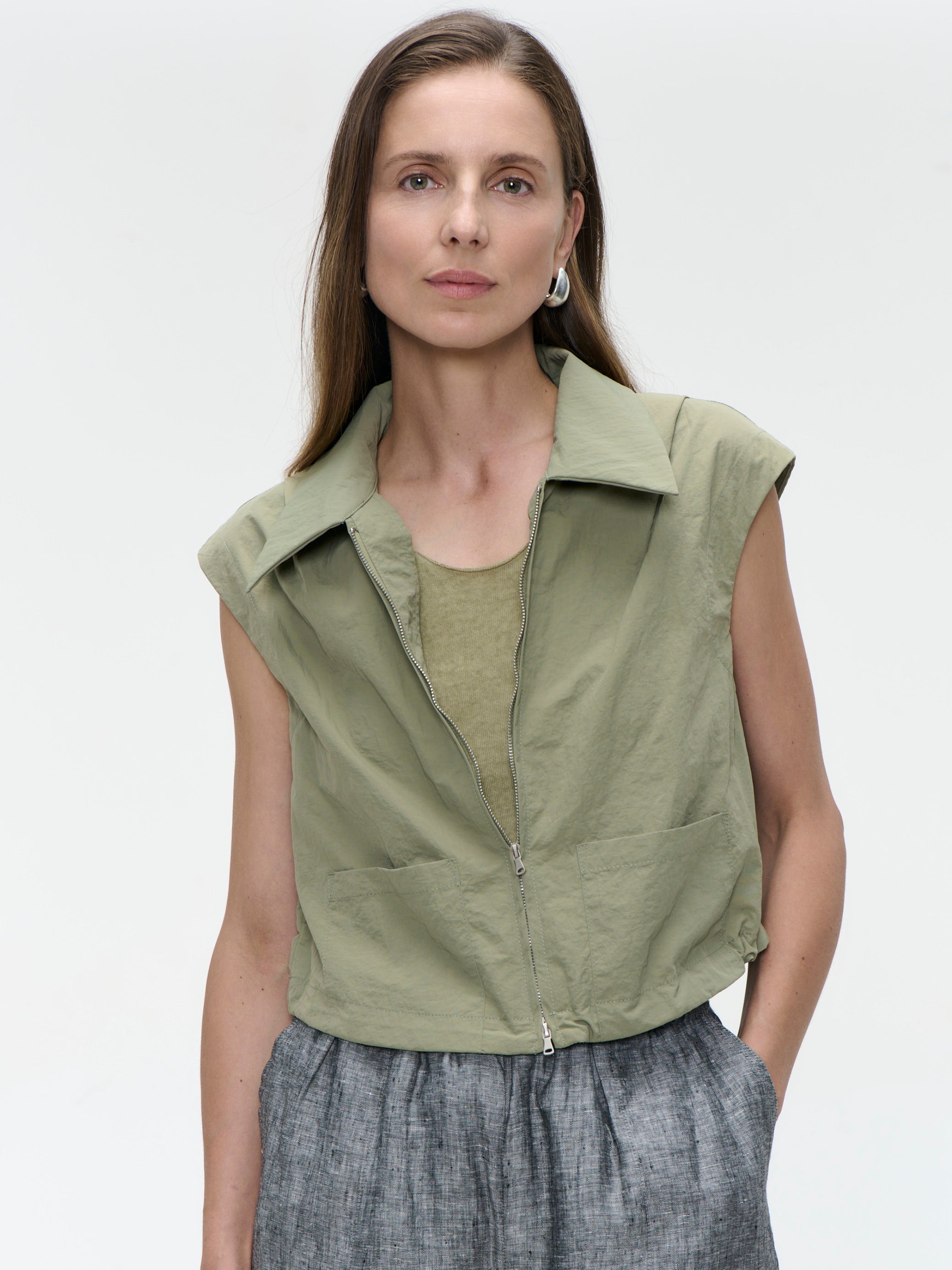 Entra nel mondo del minimalismo moderno con la Emiko Taffeta Jacket – un design senza maniche elegante che bilancia perfettamente struttura e leggerezza. Realizzata in taffetà di nylon leggero, presenta un taglio corto, colletto a punta e chiusura frontale con zip per un look pulito e contemporaneo. La vestibilità morbida garantisce comfort e versatilità, perfetta da abbinare a look casual o raffinati.