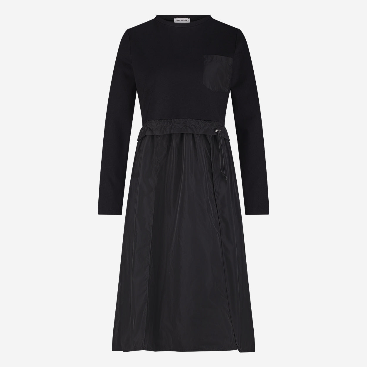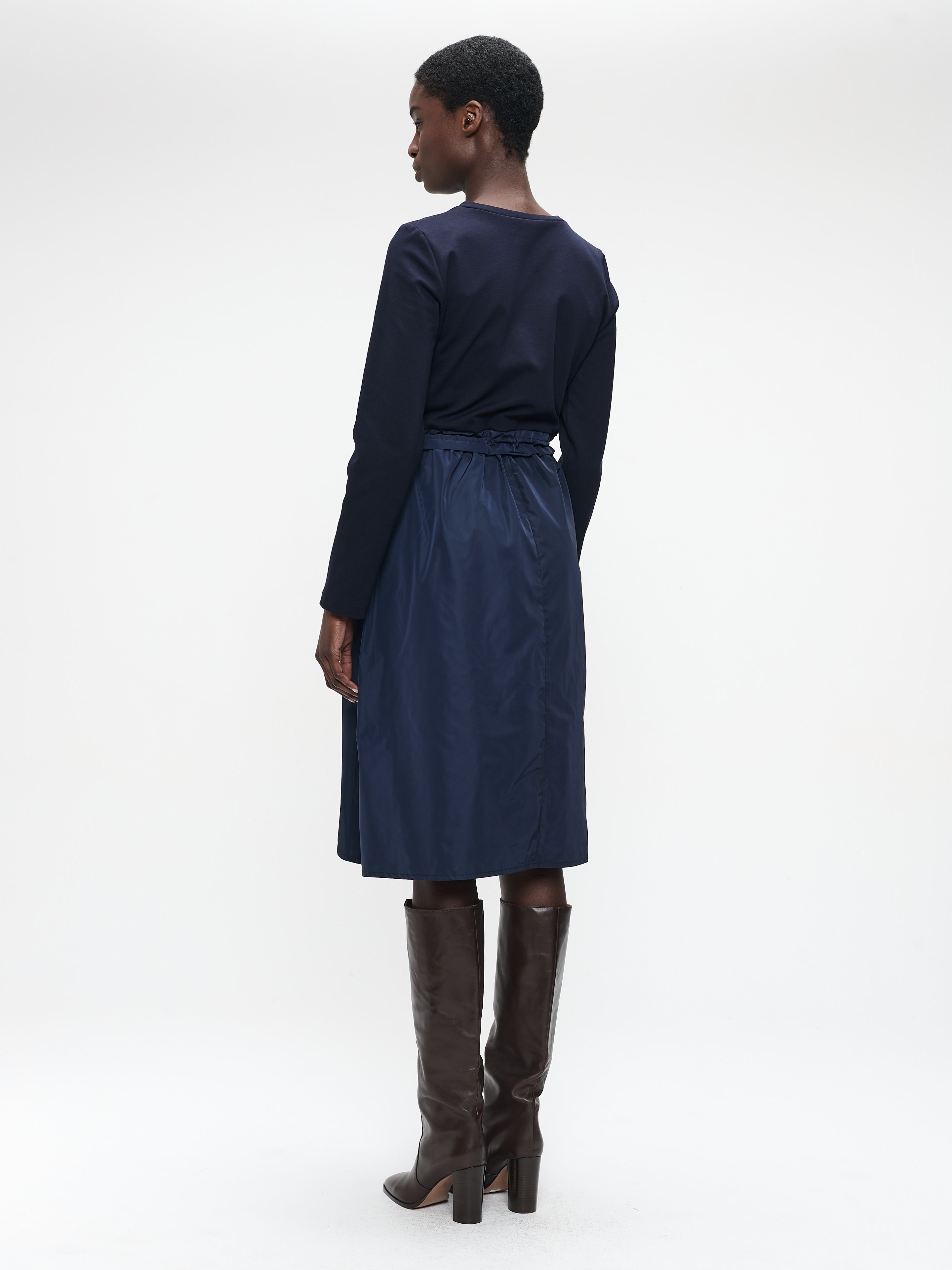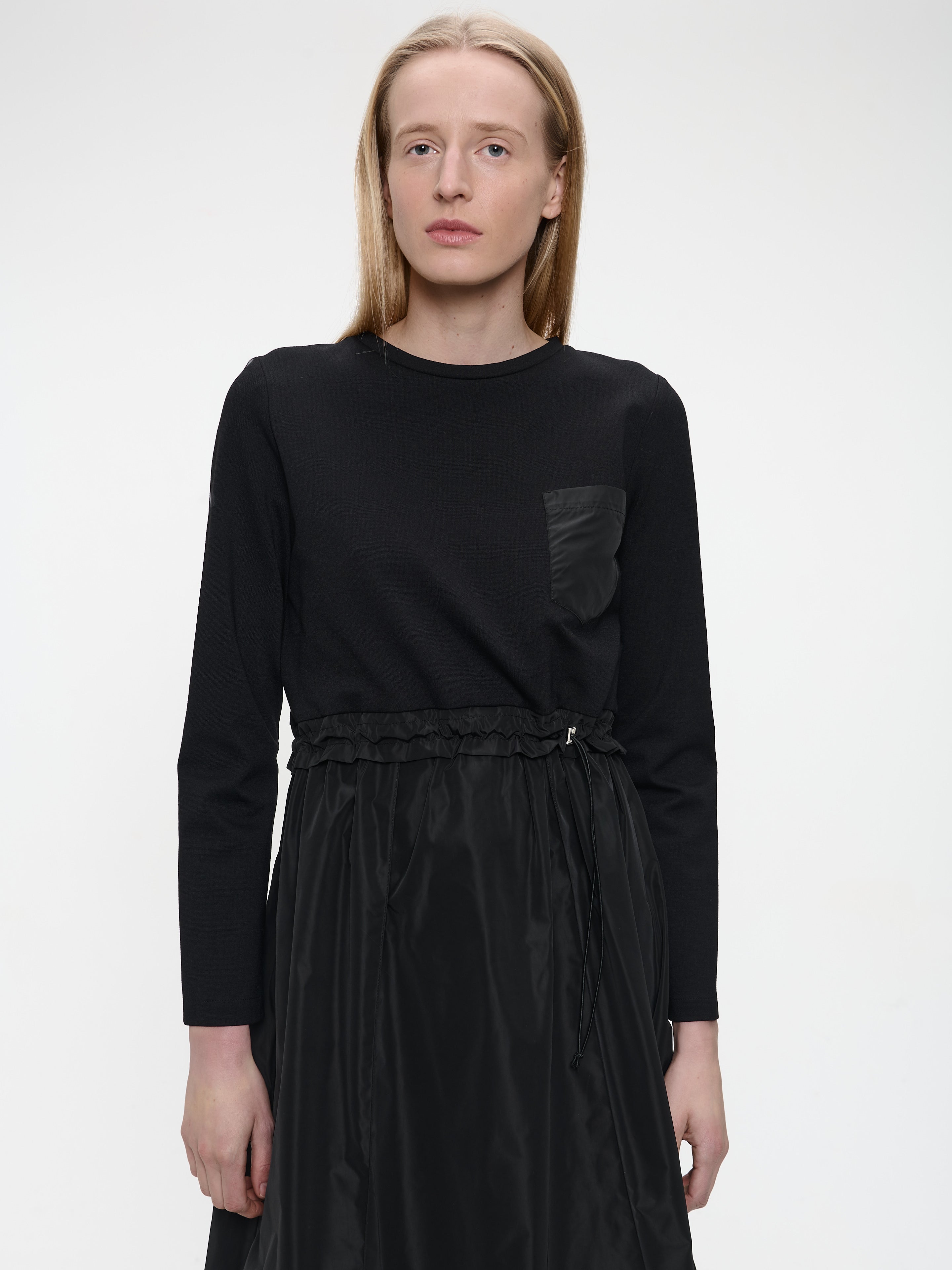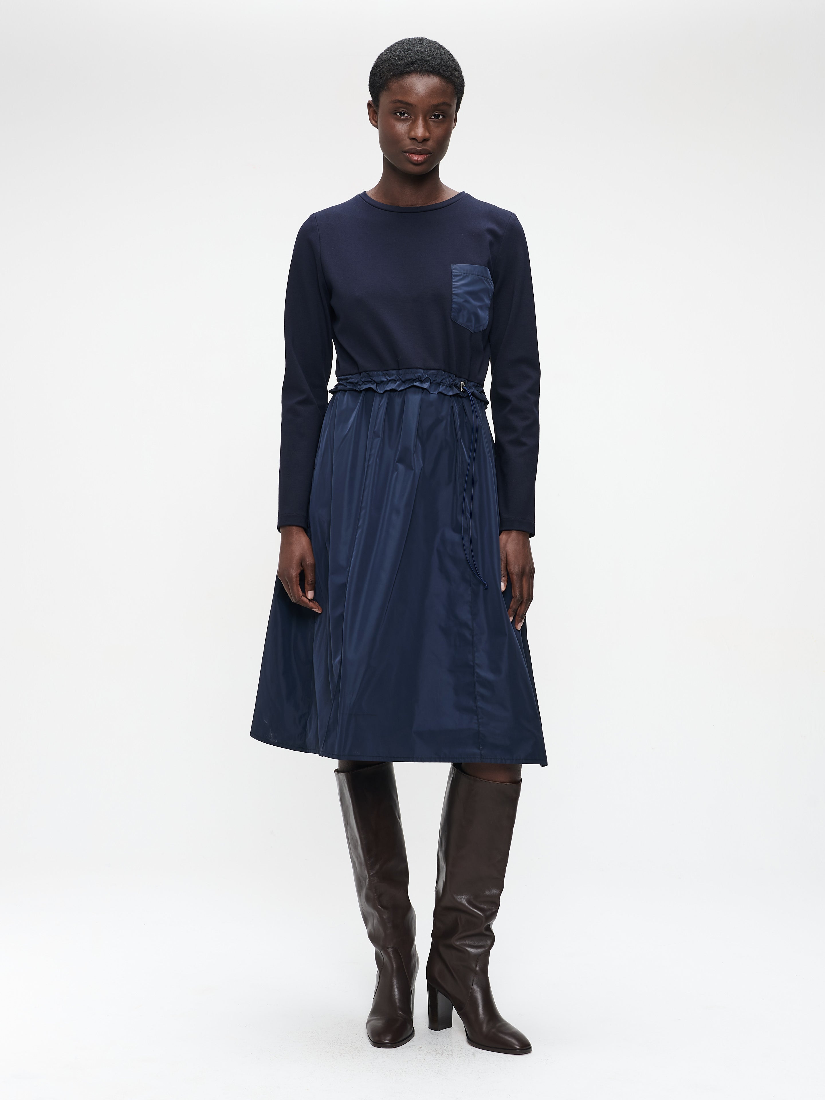 Fusione di texture e struttura, l’abito Ester Mix Cotton Taffeta propone un nuovo approccio al look da giorno. La parte superiore è realizzata in morbido jersey misto viscosa, mentre la gonna è in taffetà leggero che aggiunge volume e lucentezza discreti. Una cintura intrecciata e una tasca sul petto tono su tono completano il look — elegante e facile da indossare, perfetto per uscite casual o occasioni formali.