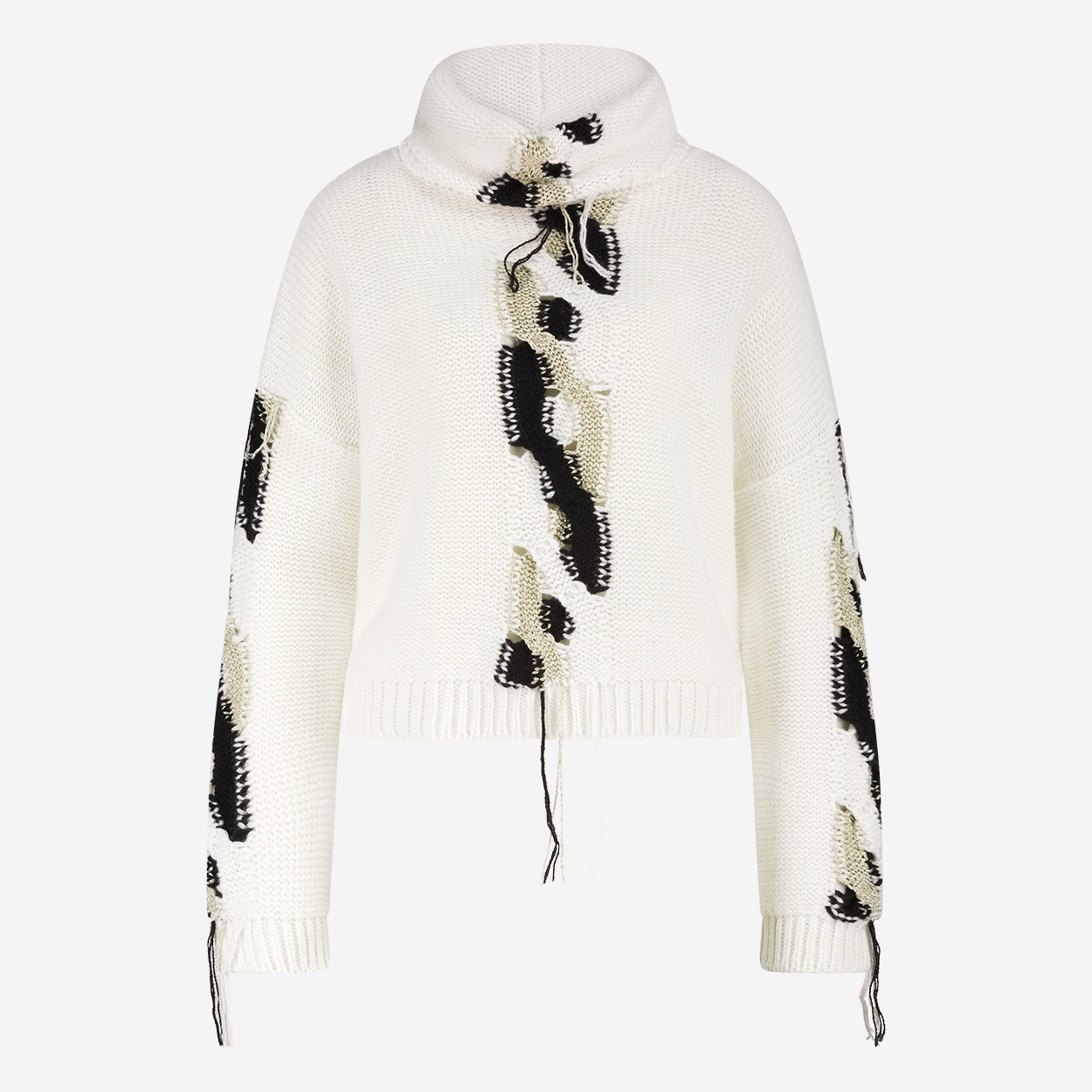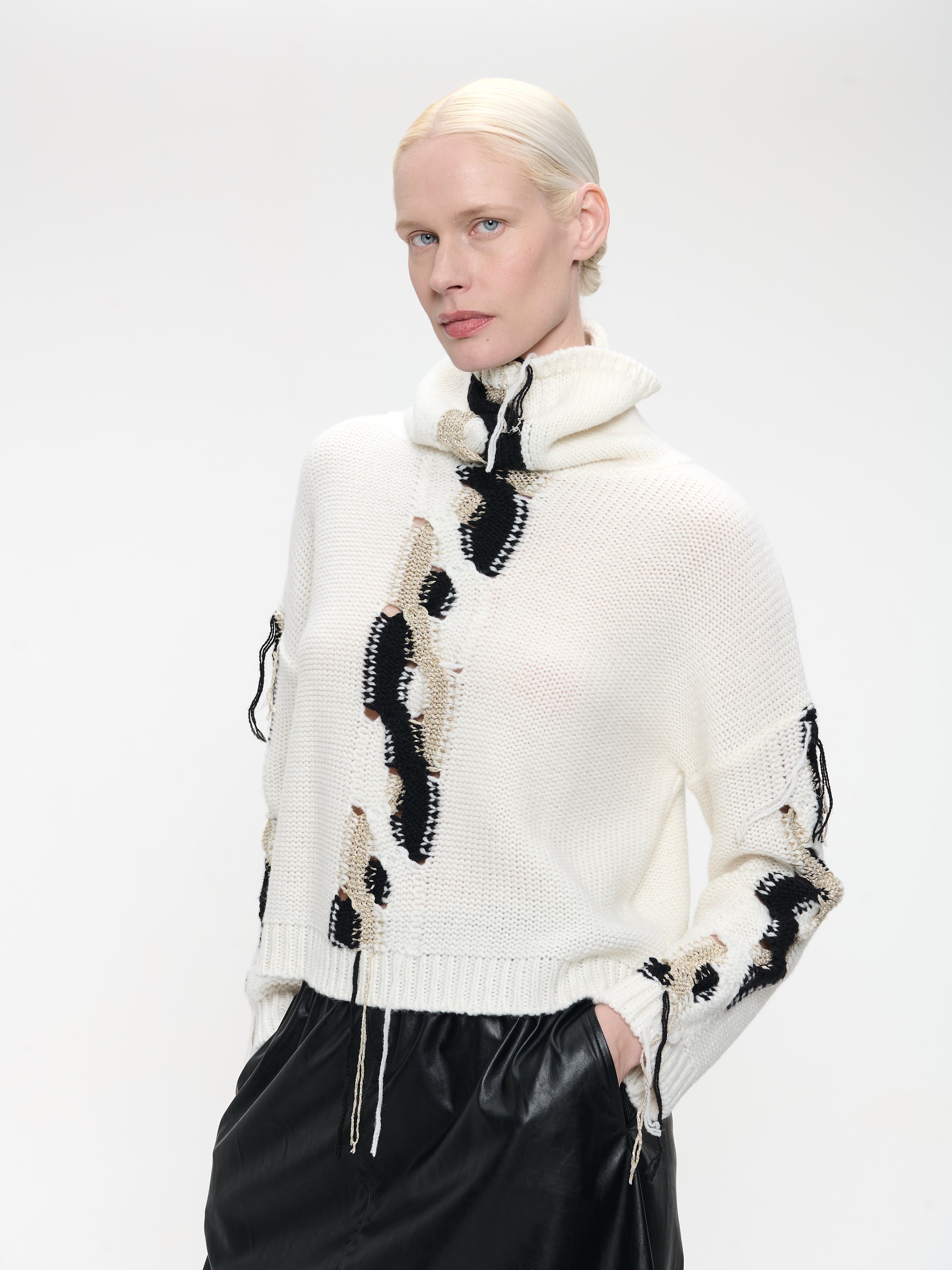 Con il suo design accattivante e la lussuosa combinazione di materiali, il Fancy high neck Pullover H25024 dona un tocco audace al tuo guardaroba invernale. I dettagli neri astratti sul fondo color crema creano un look deciso, mentre il collo alto e le spalle scese offrono una silhouette moderna, comoda e alla moda.