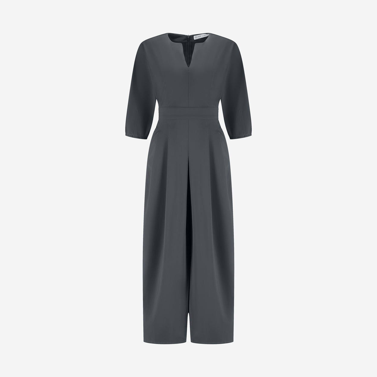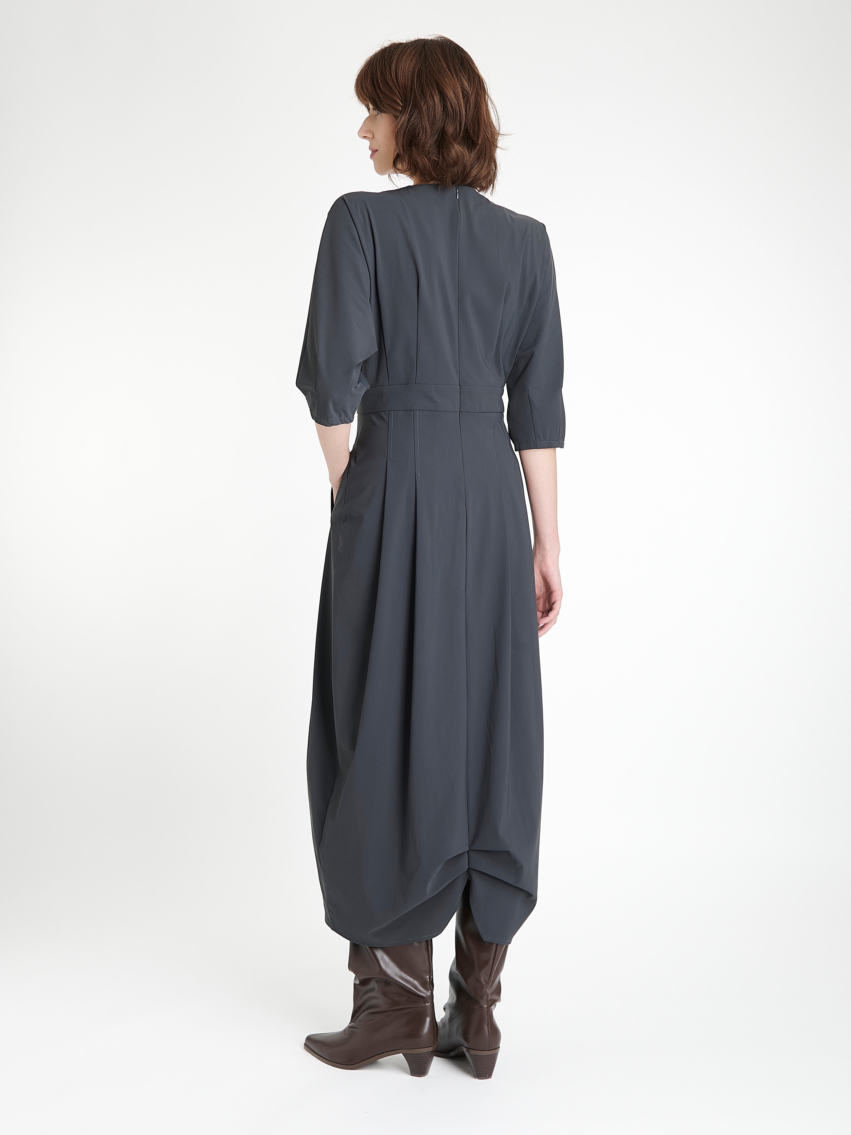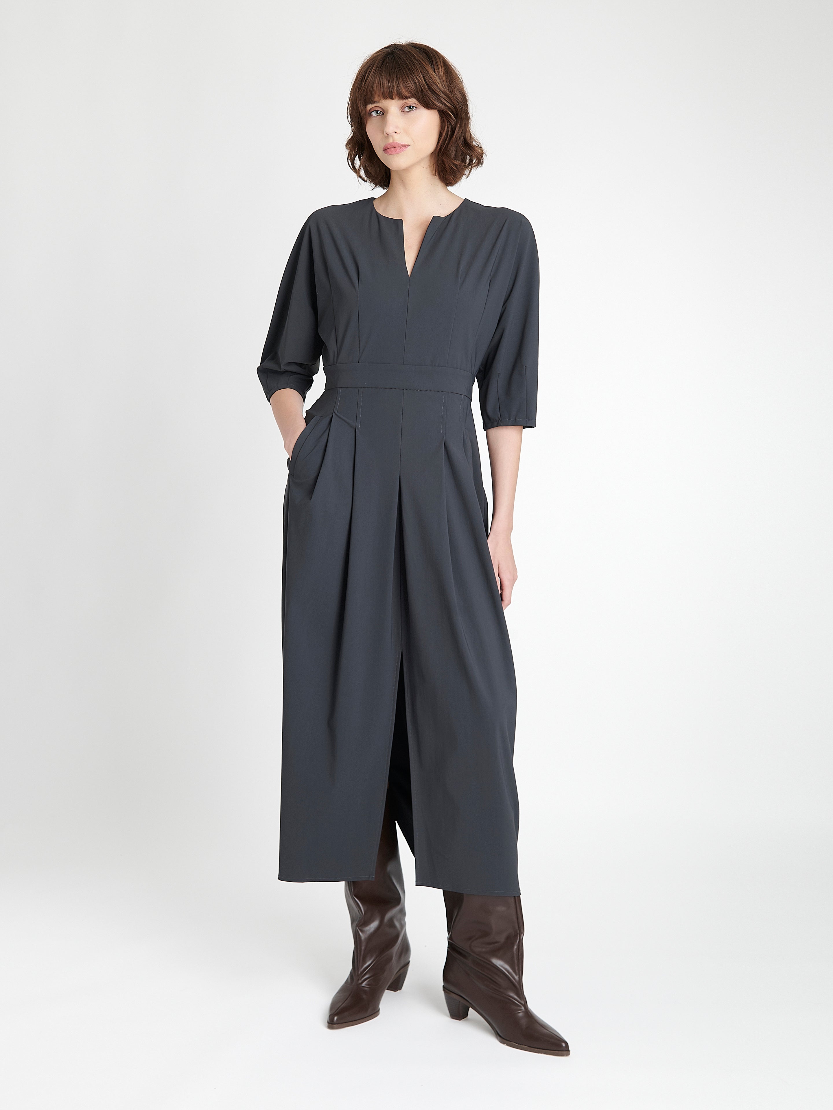 Un capo senza tempo dalla semplicità raffinata, l’abito Gaara presenta una silhouette strutturata esaltata da un morbido jersey tecnico. Con scollo a V e maniche a 3/4, valorizza la figura offrendo comfort per tutto il giorno. La gonna midi con pieghe delicate e la vita evidenziata creano un look femminile ed elegante — ideale per il lavoro o per le occasioni speciali.