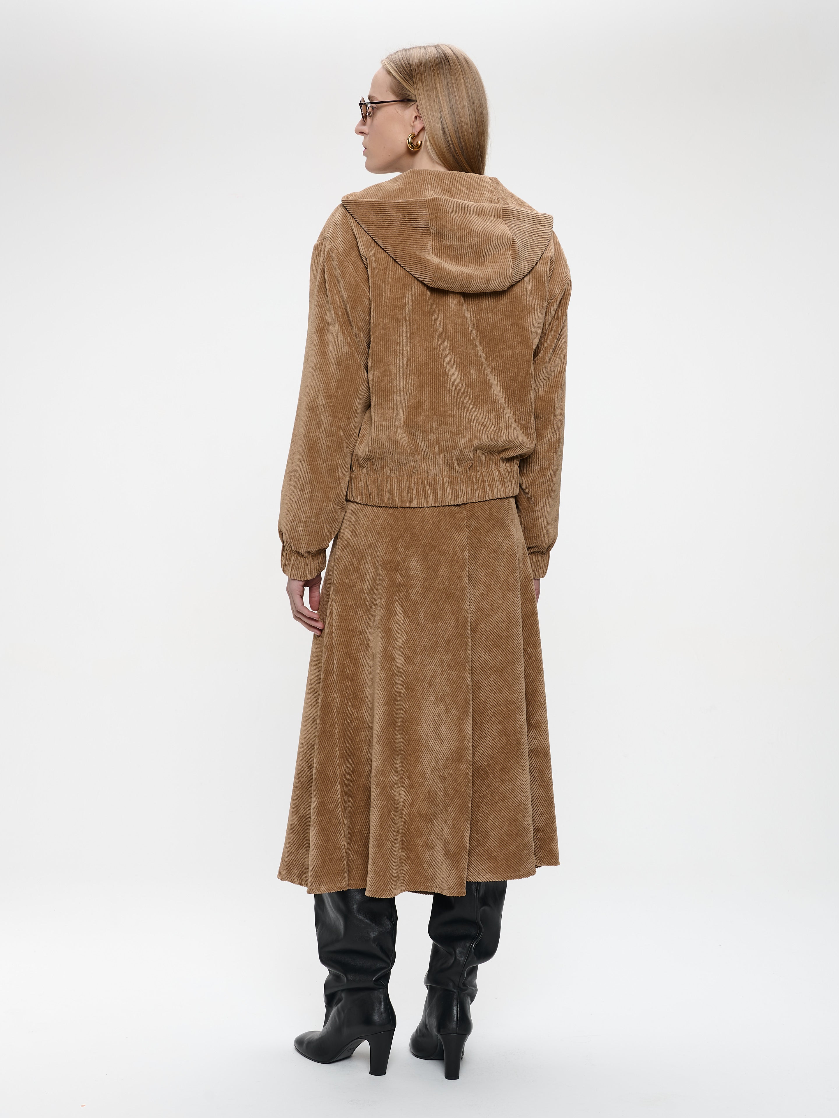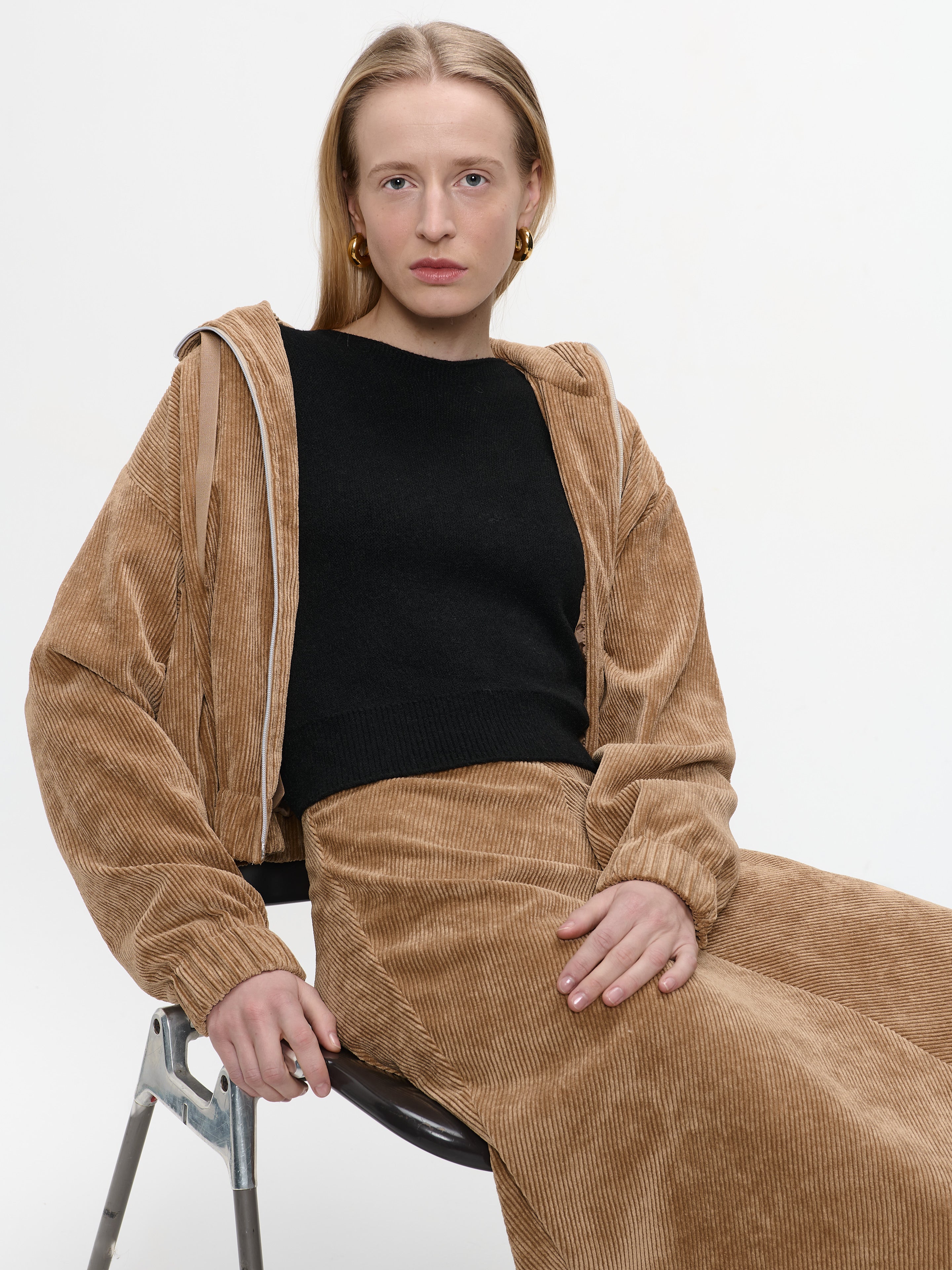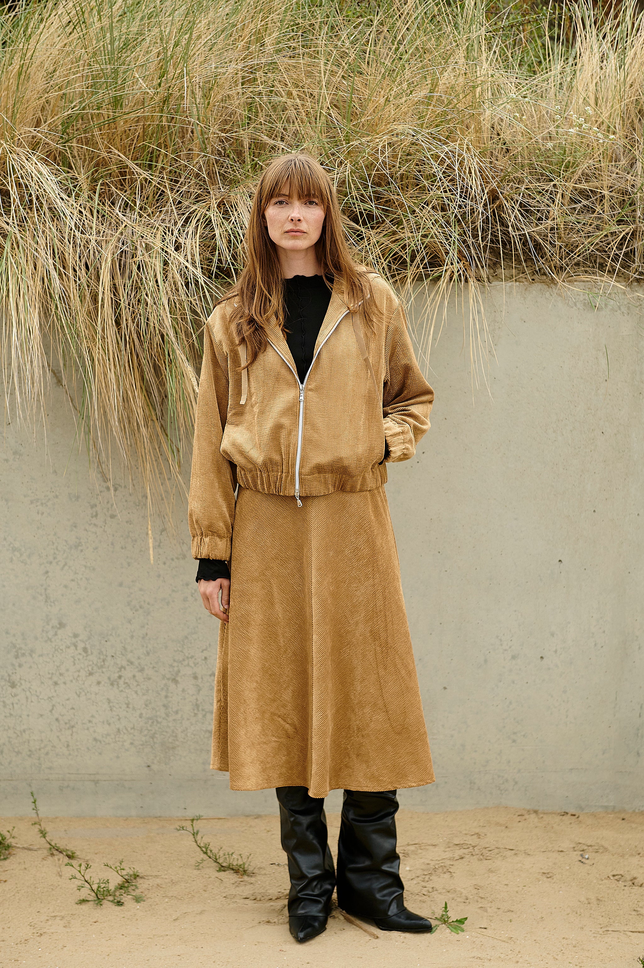Fresca e discreta senza sforzo, la giacca jeans Golia è un capo versatile che completa qualsiasi look casual. Realizzata in un morbido velluto a coste elasticizzato, presenta una silhouette rilassata, cappuccio con coulisse, chiusura frontale con zip e polsini elasticizzati. Perfetta da abbinare ai pantaloni coordinati o sopra un abito, aggiunge un tocco moderno al guardaroba.