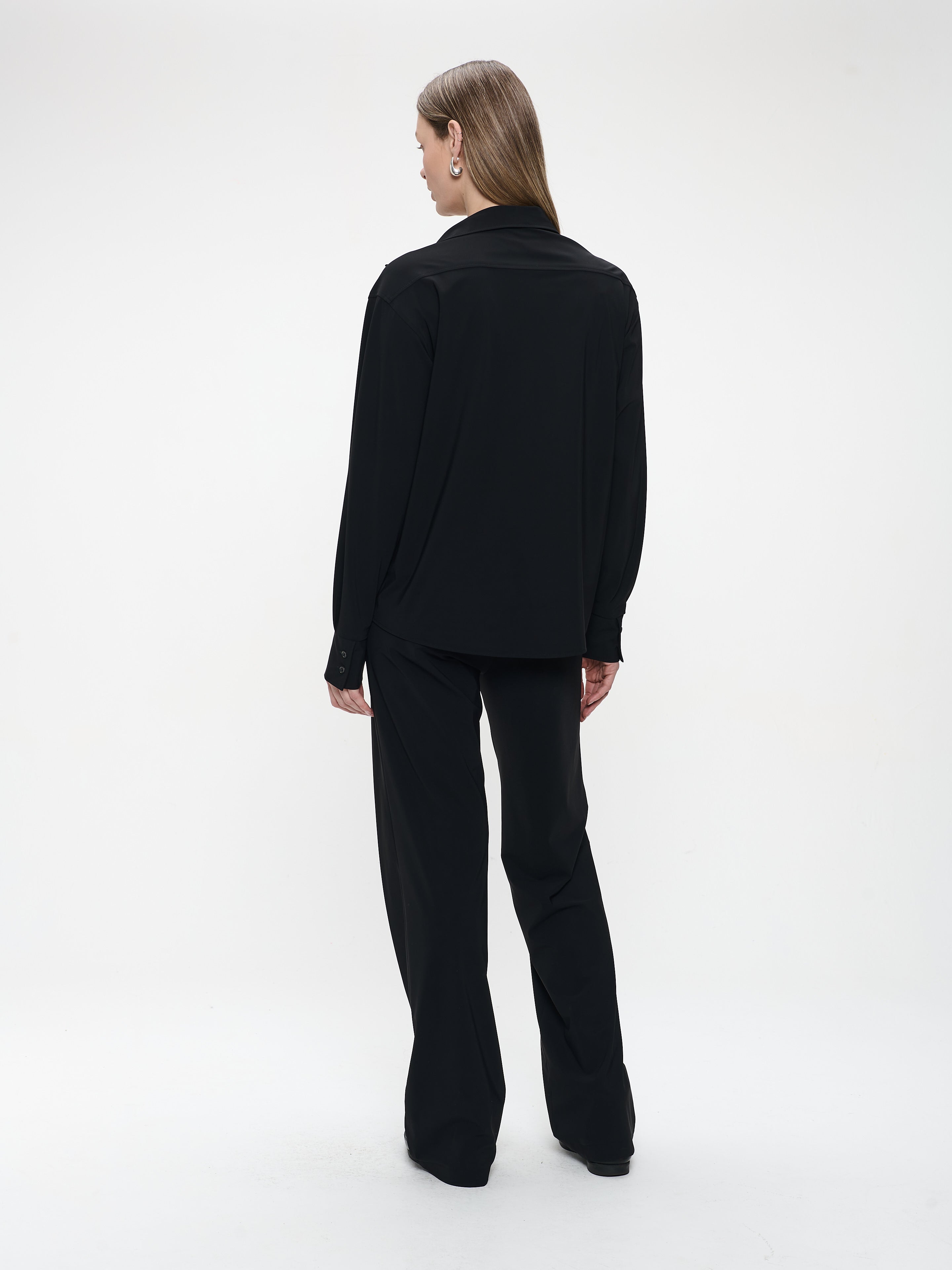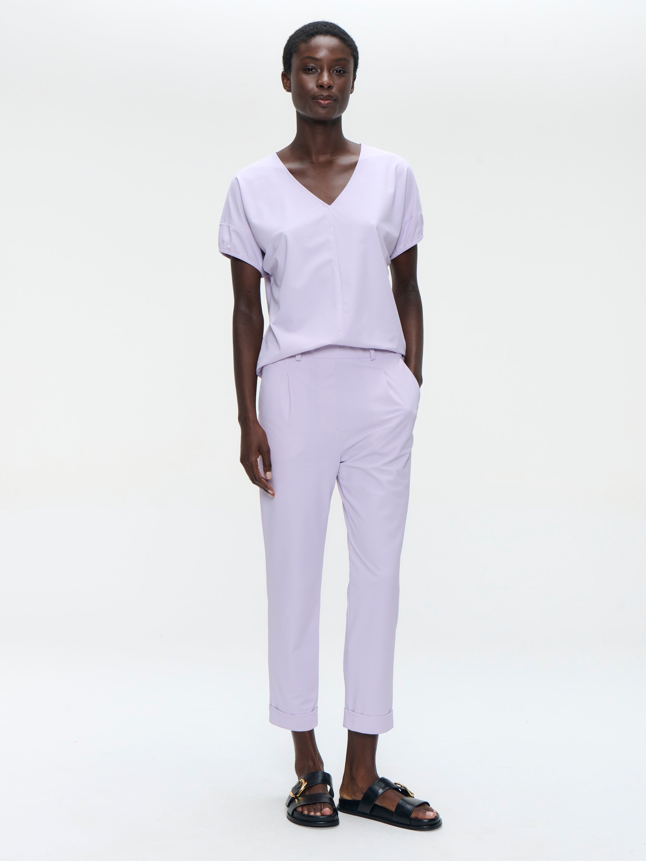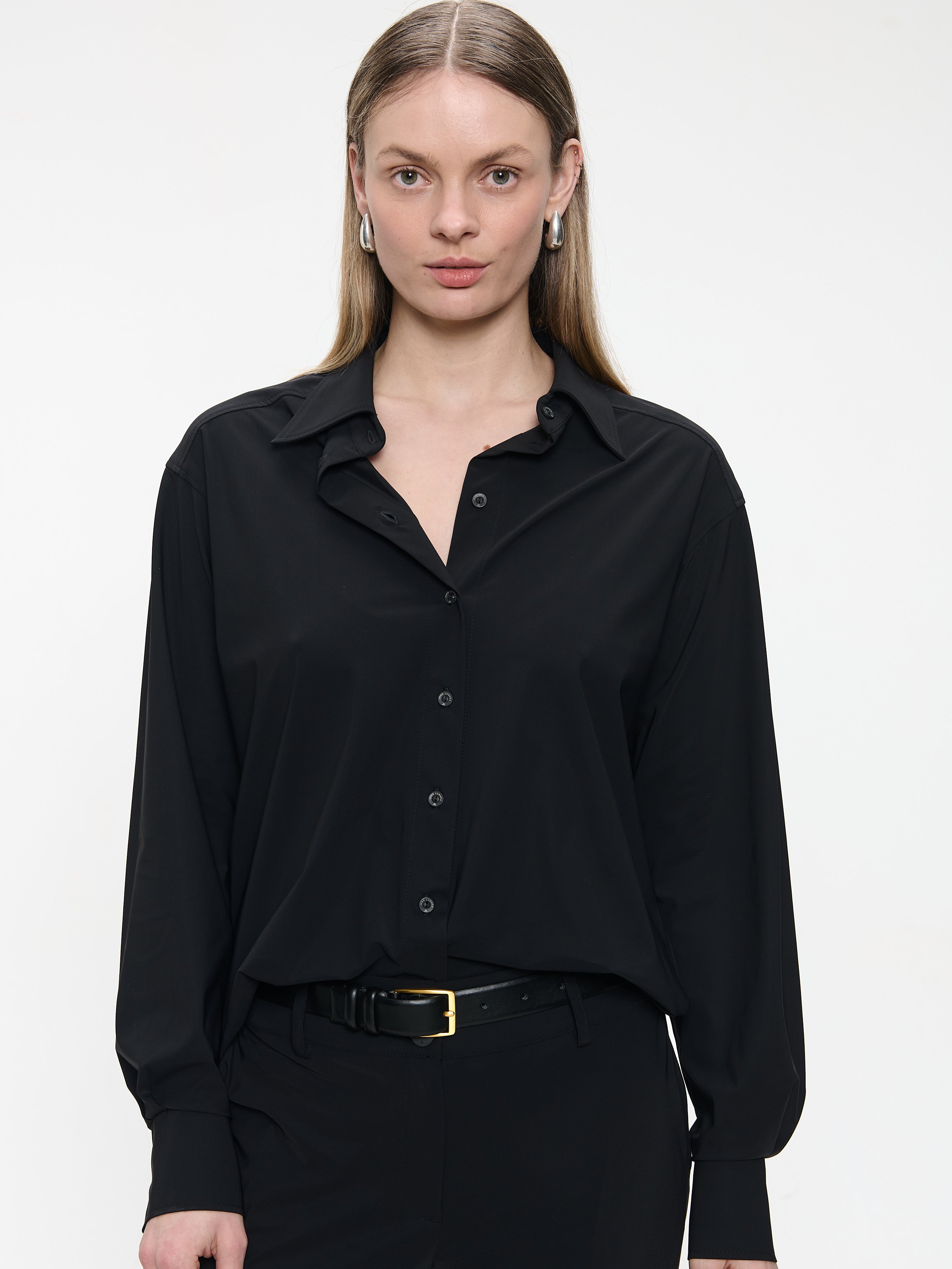 Iva Camicetta in jersey tecnico stretch: Realizzata in leggero jersey tecnico, la blusa Iva offre una silhouette classica con un tocco moderno. Caratterizzata da sottili dettagli a sfioramento sulle maniche, questa blusa combina comfort e sobria eleganza, perfetta sia per l'abbigliamento quotidiano che per le occasioni più raffinate.