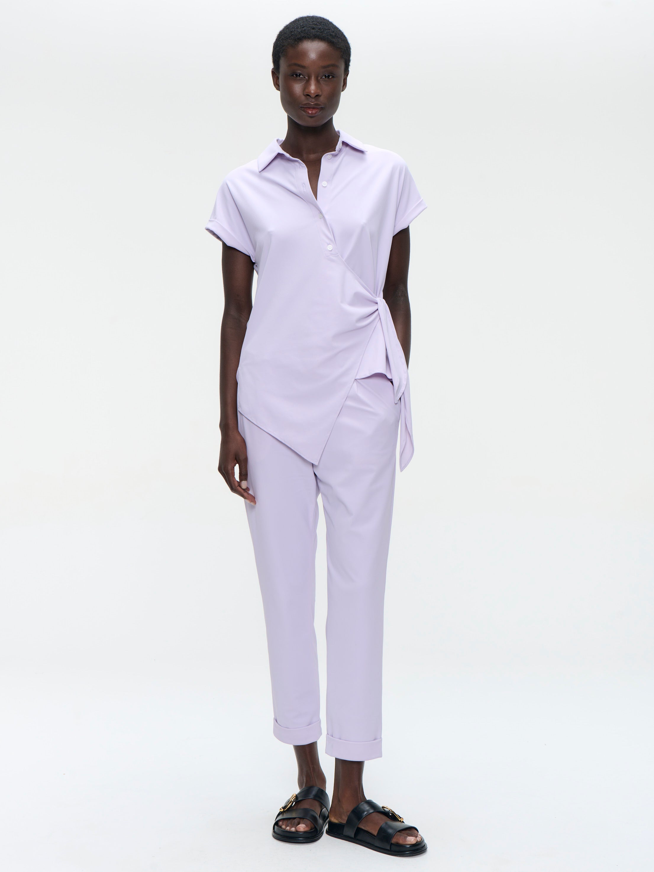 Camicetta Aston in jersey high-tech: Realizzata in jersey high-tech, la blusa Aston presenta una chiusura a mezzo bottone, maniche corte e un elegante nodo frontale. Combinando comfort e design moderno, questa blusa è perfetta per un look elegante e senza sforzo, ideale per ogni occasione.