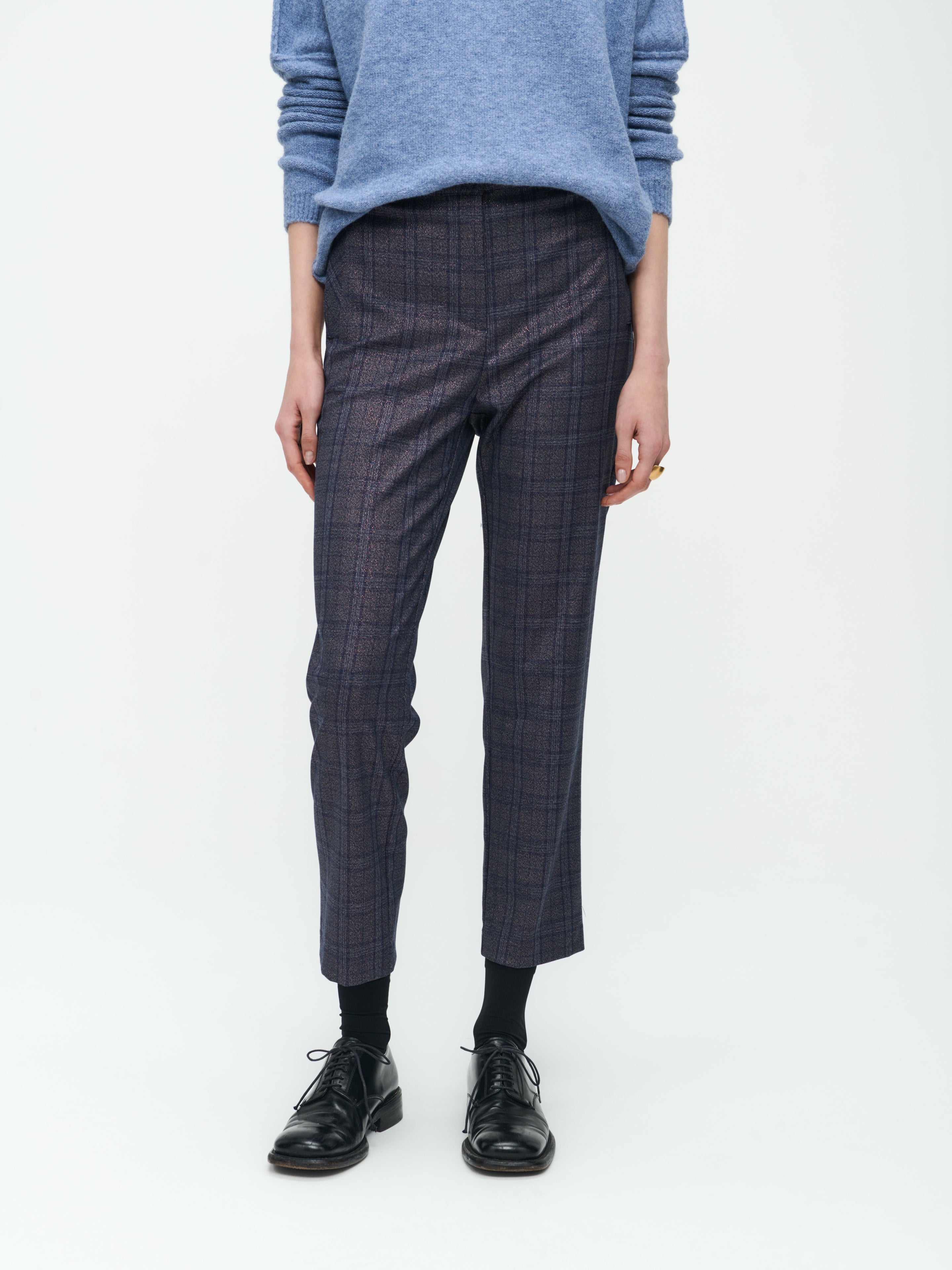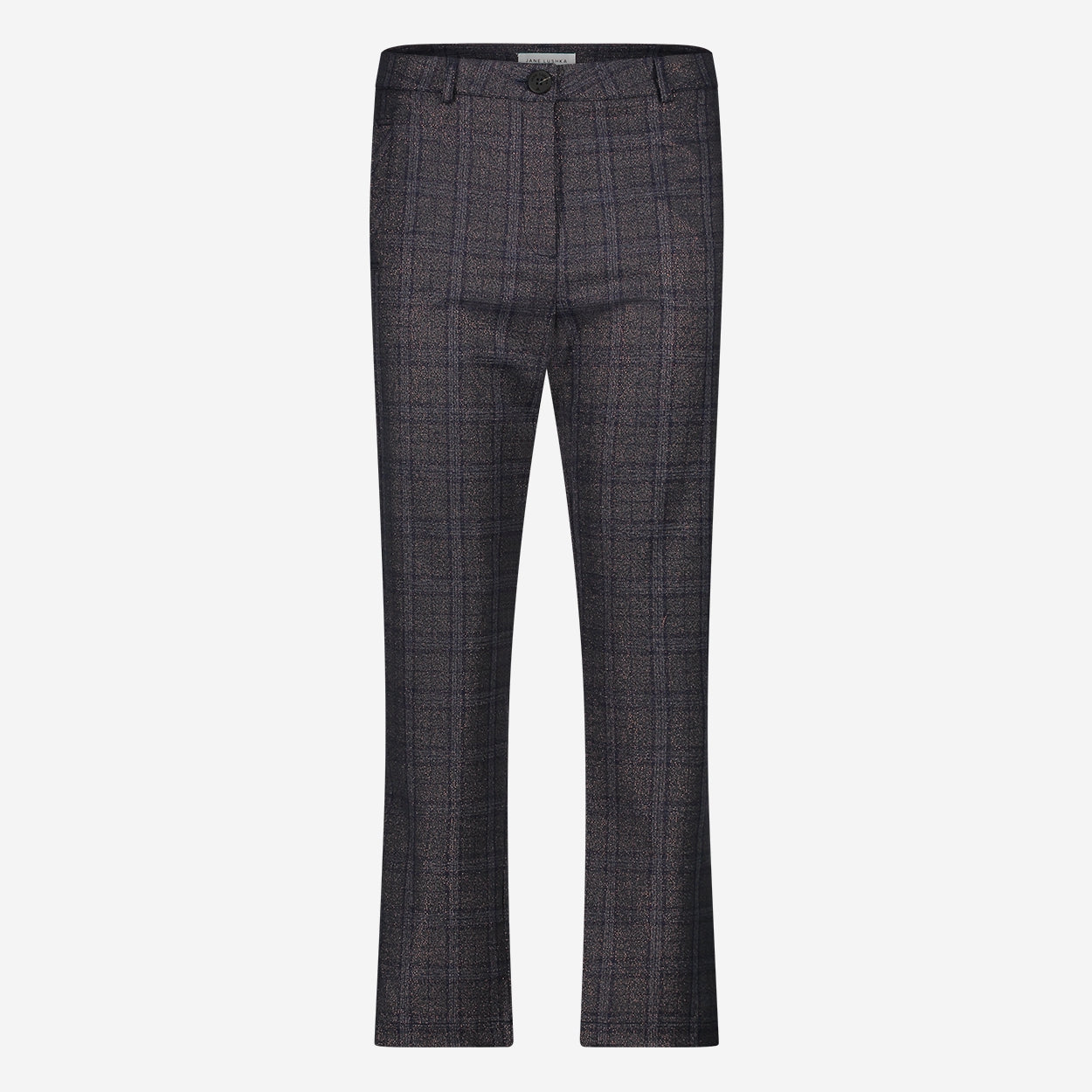 Pantaloni Mirel: Tuffatevi nell'eleganza con i nostri pantaloni in poli-viscosa che vantano un'accattivante struttura lucida a quadri, aggiungendo un tocco di glamour al vostro look.