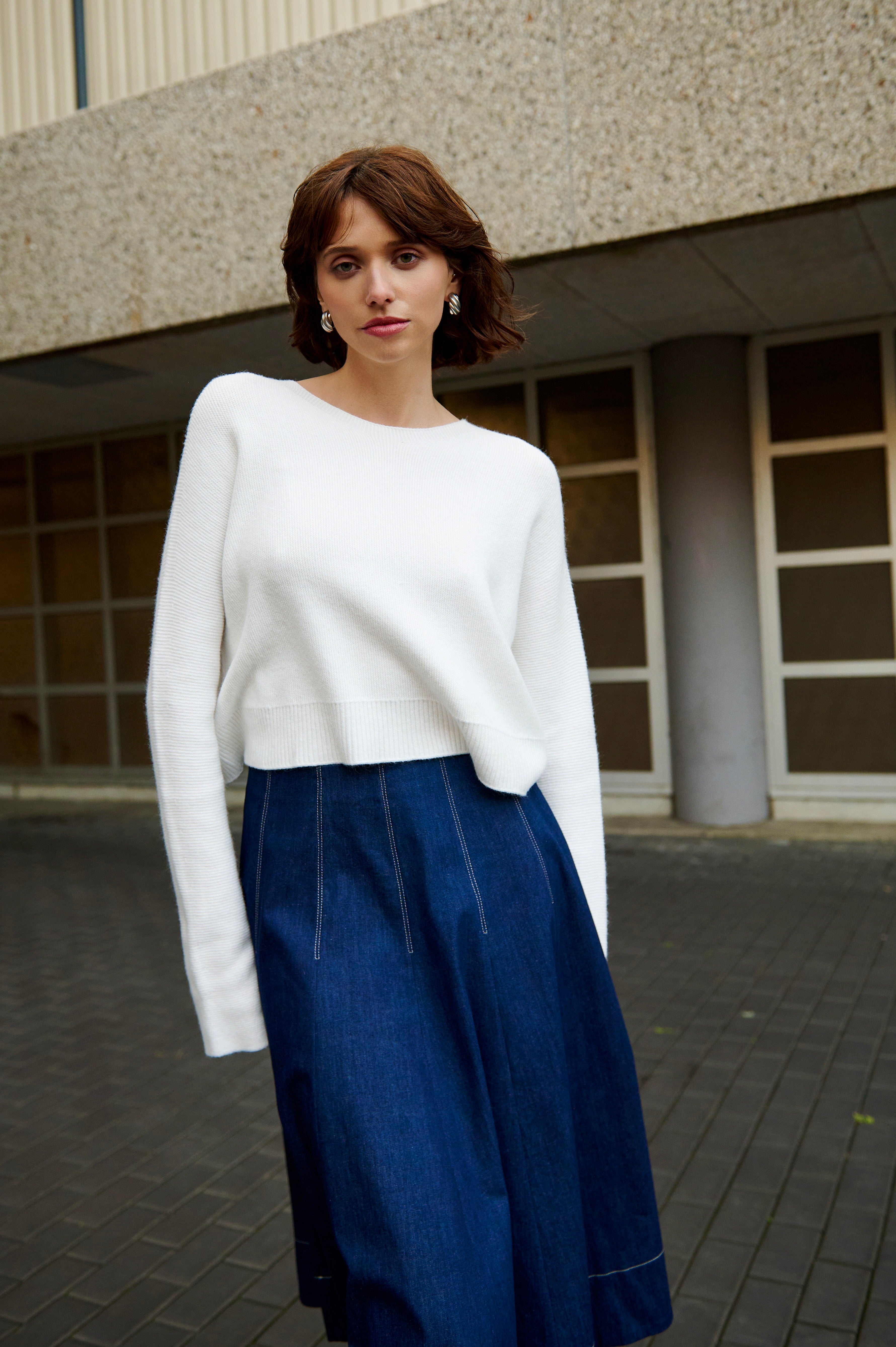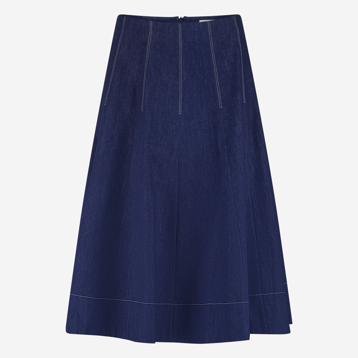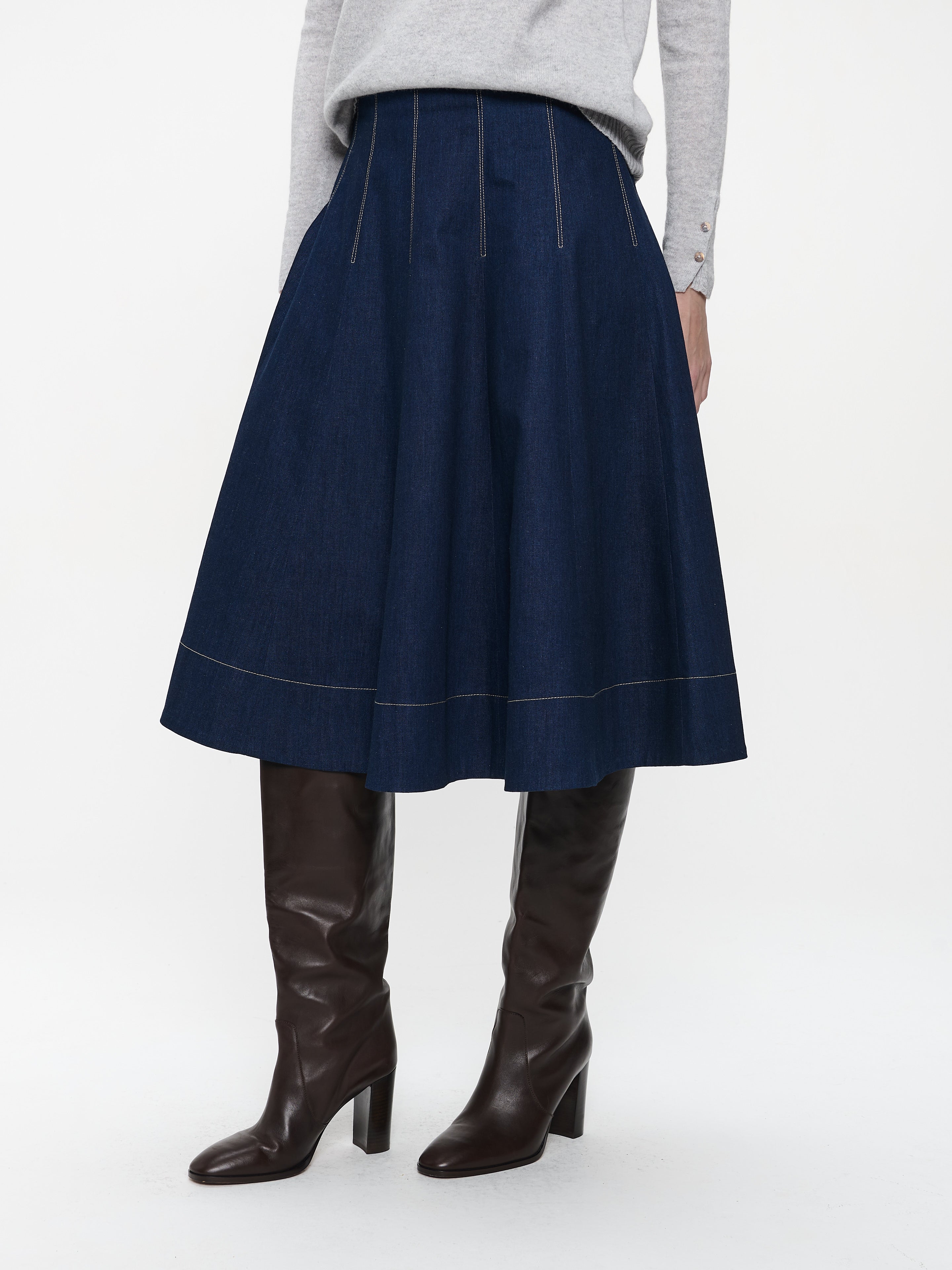 La gonna denim Mishele a linea A unisce struttura e femminilità. I dettagli delle pieghe cucite aggiungono interesse visivo e forma, mentre la lunghezza midi e il colore indaco scuro offrono un’eleganza senza tempo. Abbinala a maglie morbide o camicie strutturate per uno stile versatile durante tutta la stagione.