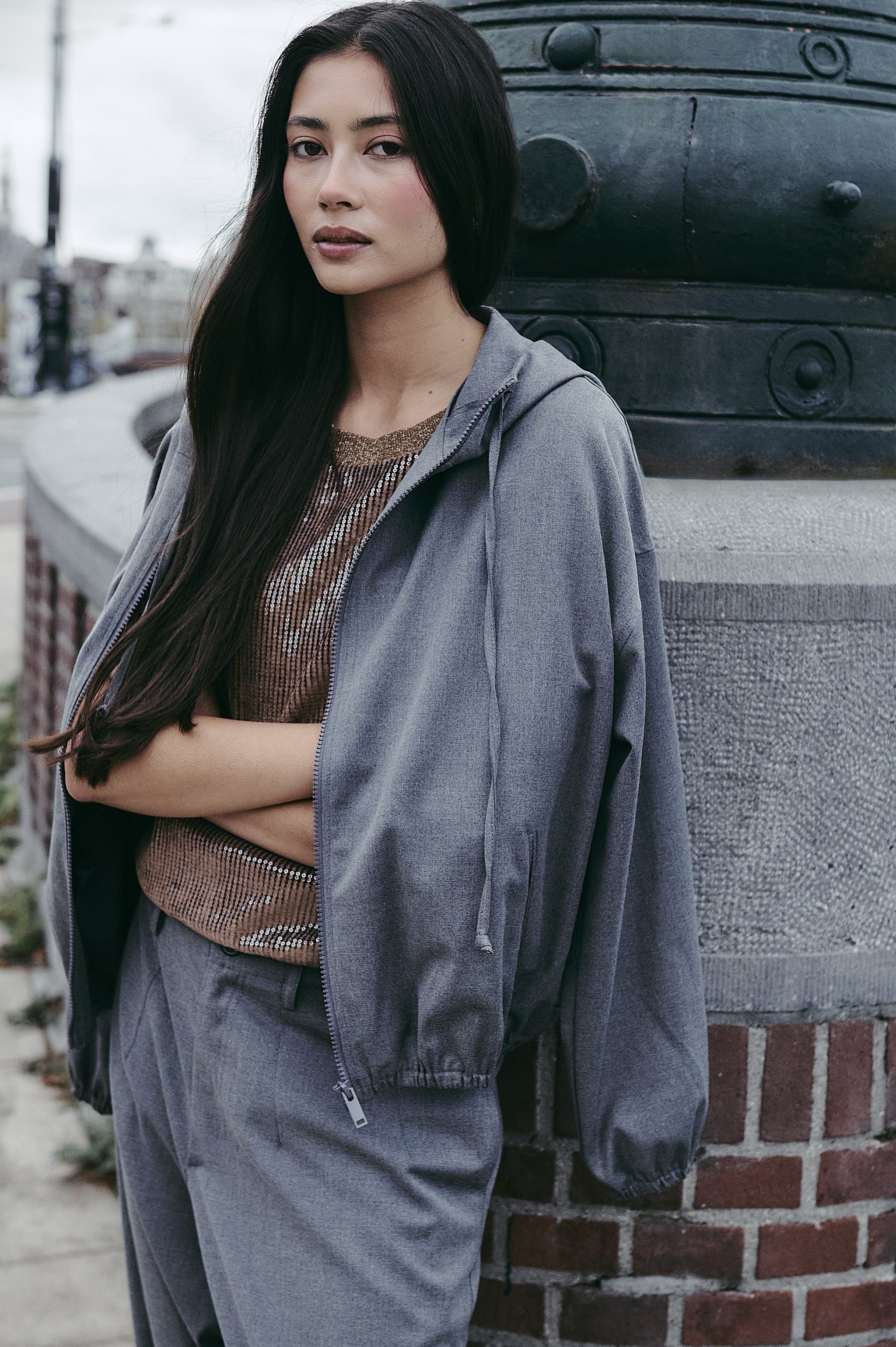 Realizzata in una miscela fluida ma strutturata di poliestere, viscosa ed elastan, questa giacca con cappuccio aggiunge un tocco casual raffinato al tuo guardaroba. Il taglio morbido, i polsini elasticizzati e la chiusura con zip la rendono perfetta per i giorni più freschi. Ideale con pantaloni sartoriali o maglieria morbida.