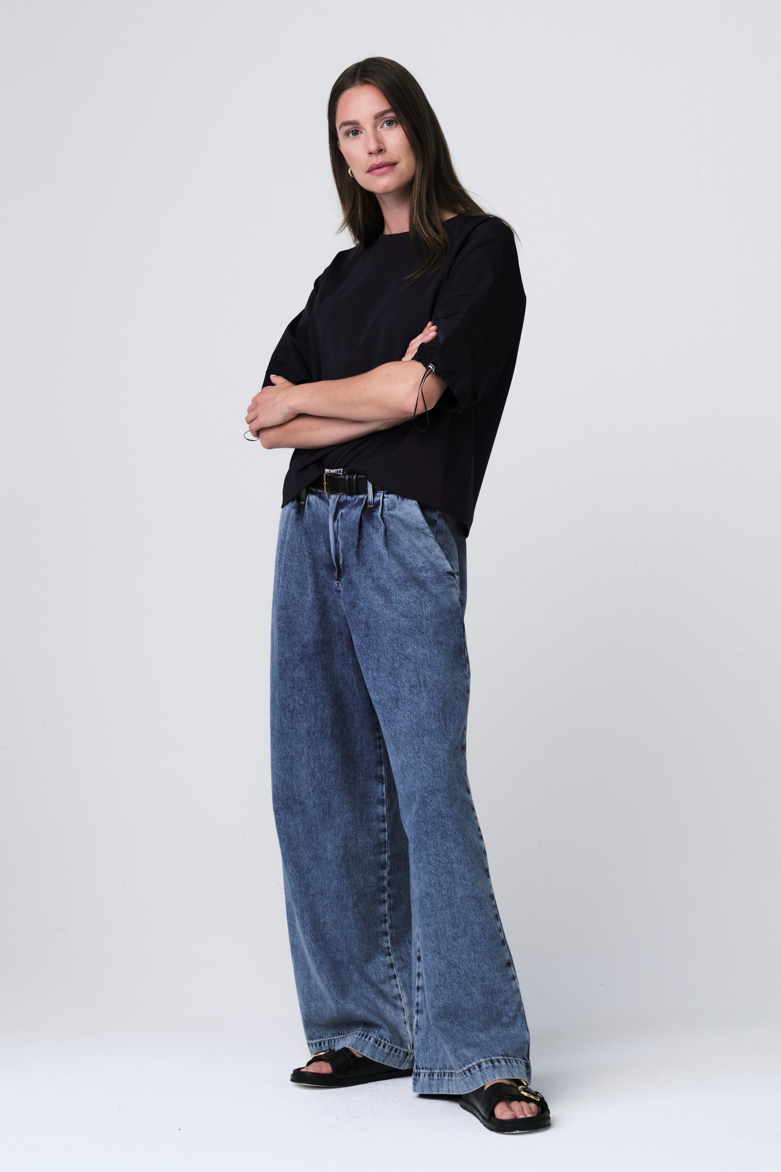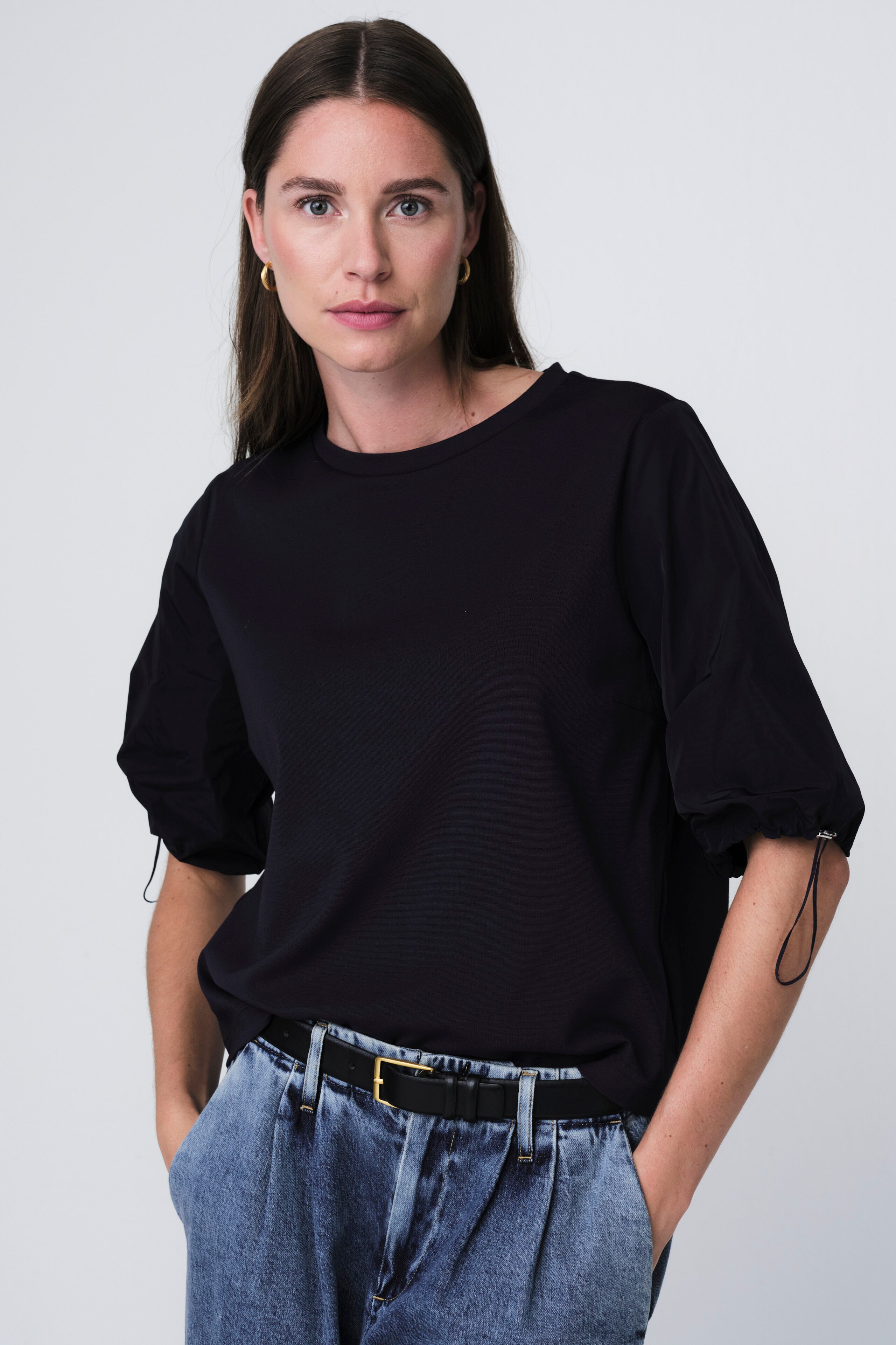 La blusa Pamela unisce il comfort sportivo all’eleganza raffinata. Realizzata con corpo in morbido jersey e maniche in taffetà, crea un interessante contrasto di texture. Il dettaglio con coulisse regolabile sulle maniche aggiunge un tocco moderno e femminile, perfetta sia per look casual che eleganti.