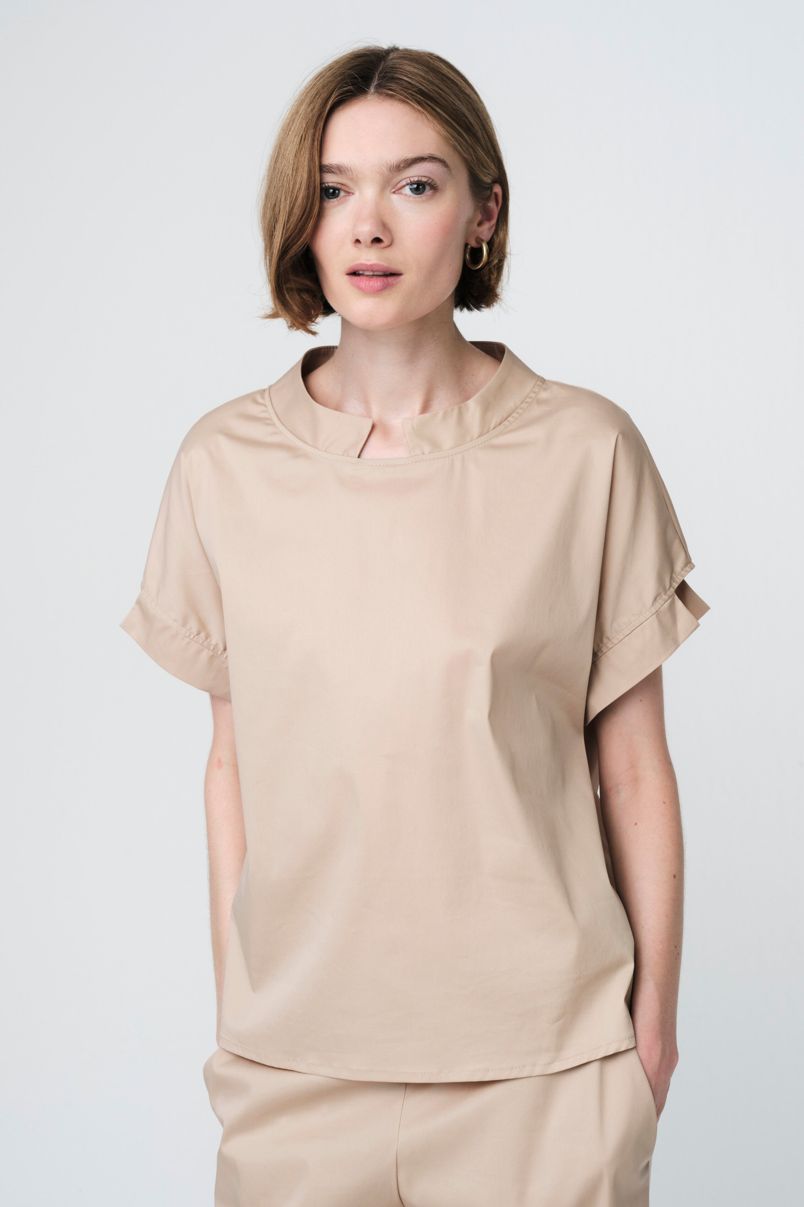 Il Poplin Loose Fit Top di Jane Lushka esprime un’eleganza rilassata e moderna. Realizzato in Italia in un pregiato mix di cotone con nylon ed elastan, offre un perfetto equilibrio tra struttura e comfort. Il design pulito, con maniche corte, colletto alto e linea leggermente squadrata, lo rende ideale per look minimal e contemporanei.