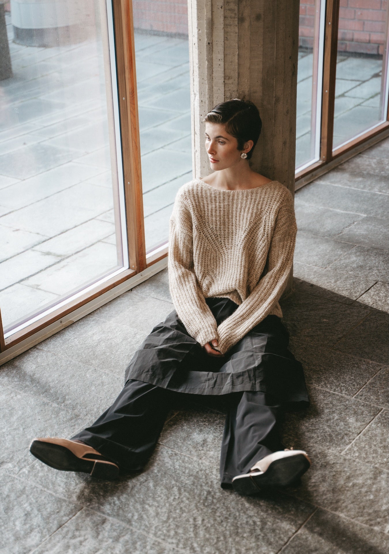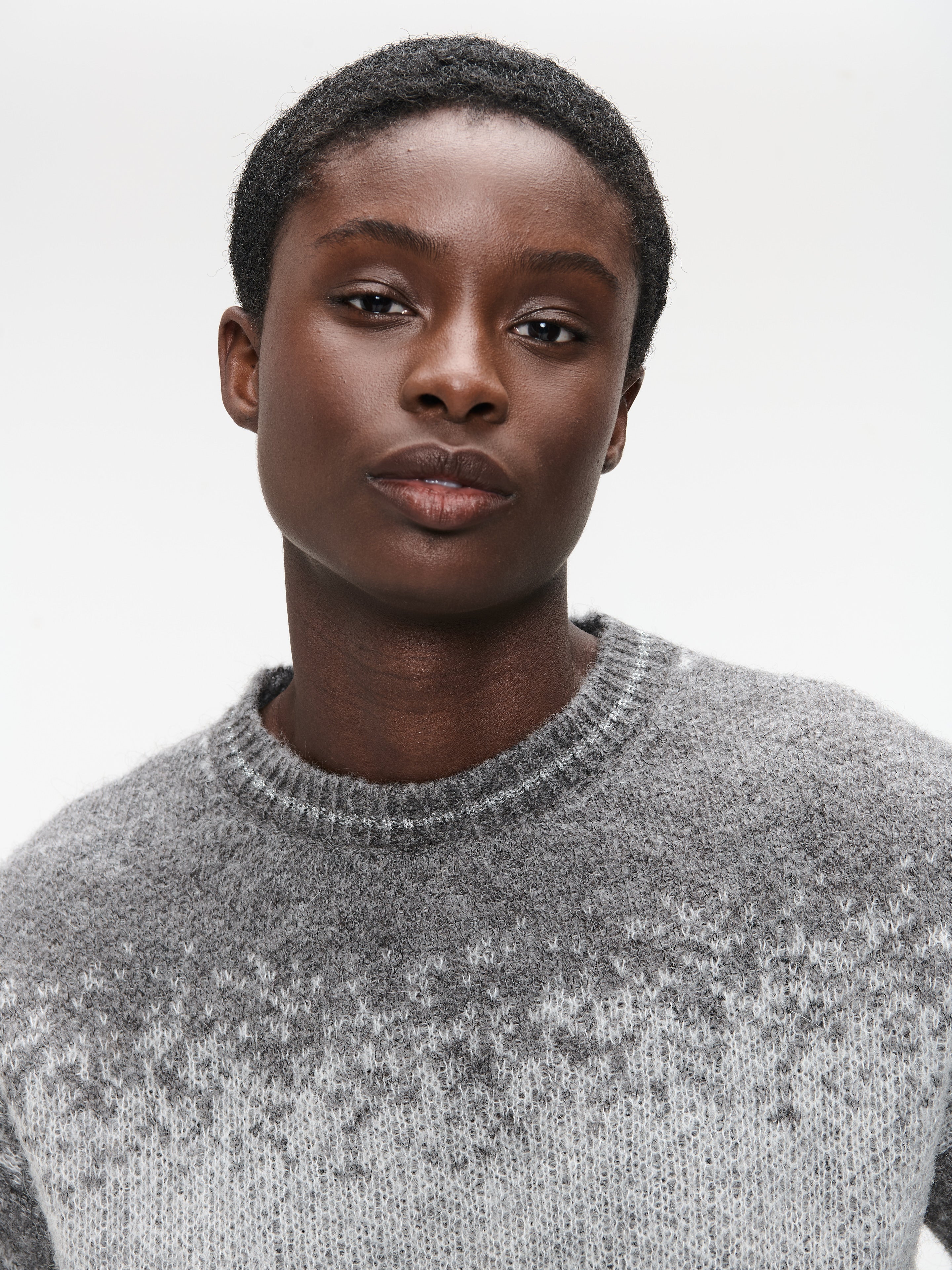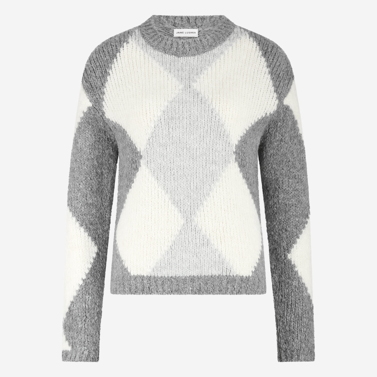 Il Pullover Rhomboids 1082 è un maglione morbido con classico scollo rotondo e un motivo a rombi ispirato all’argyle in tonalità neutre.
