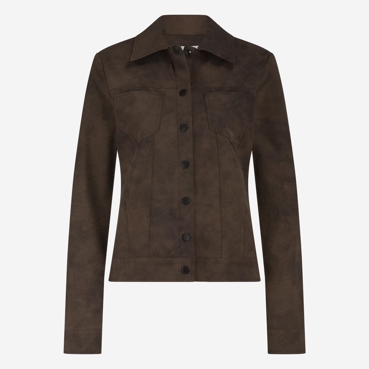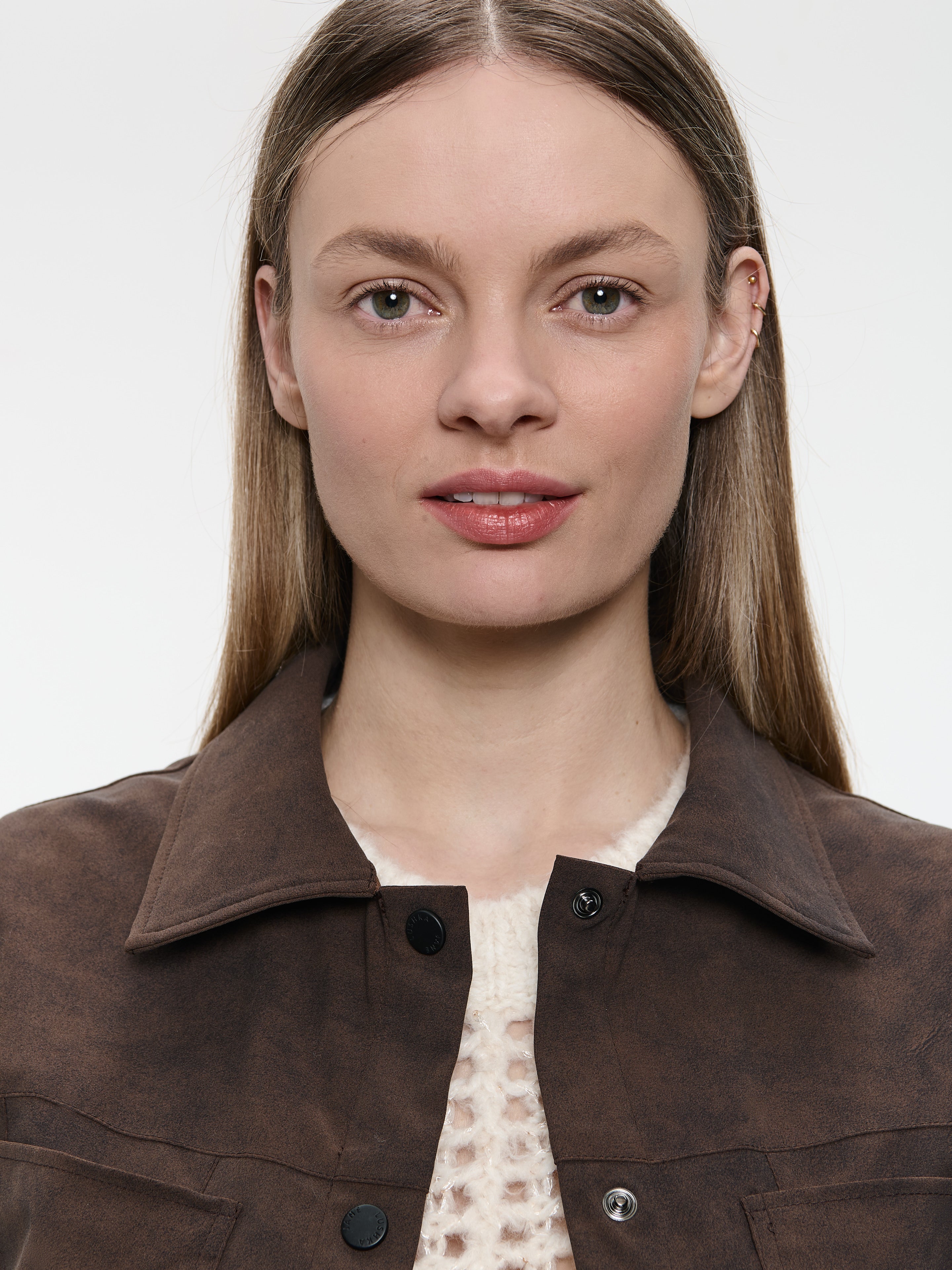 Dotata di abbottonatura frontale, colletto a camicia e taschino sul petto, offre un look casual chic con una texture raffinata. Il ricco tono marrone aggiunge calore e versatilità, perfetta per lo styling autunnale – in coordinato o abbinata a maglieria e denim.