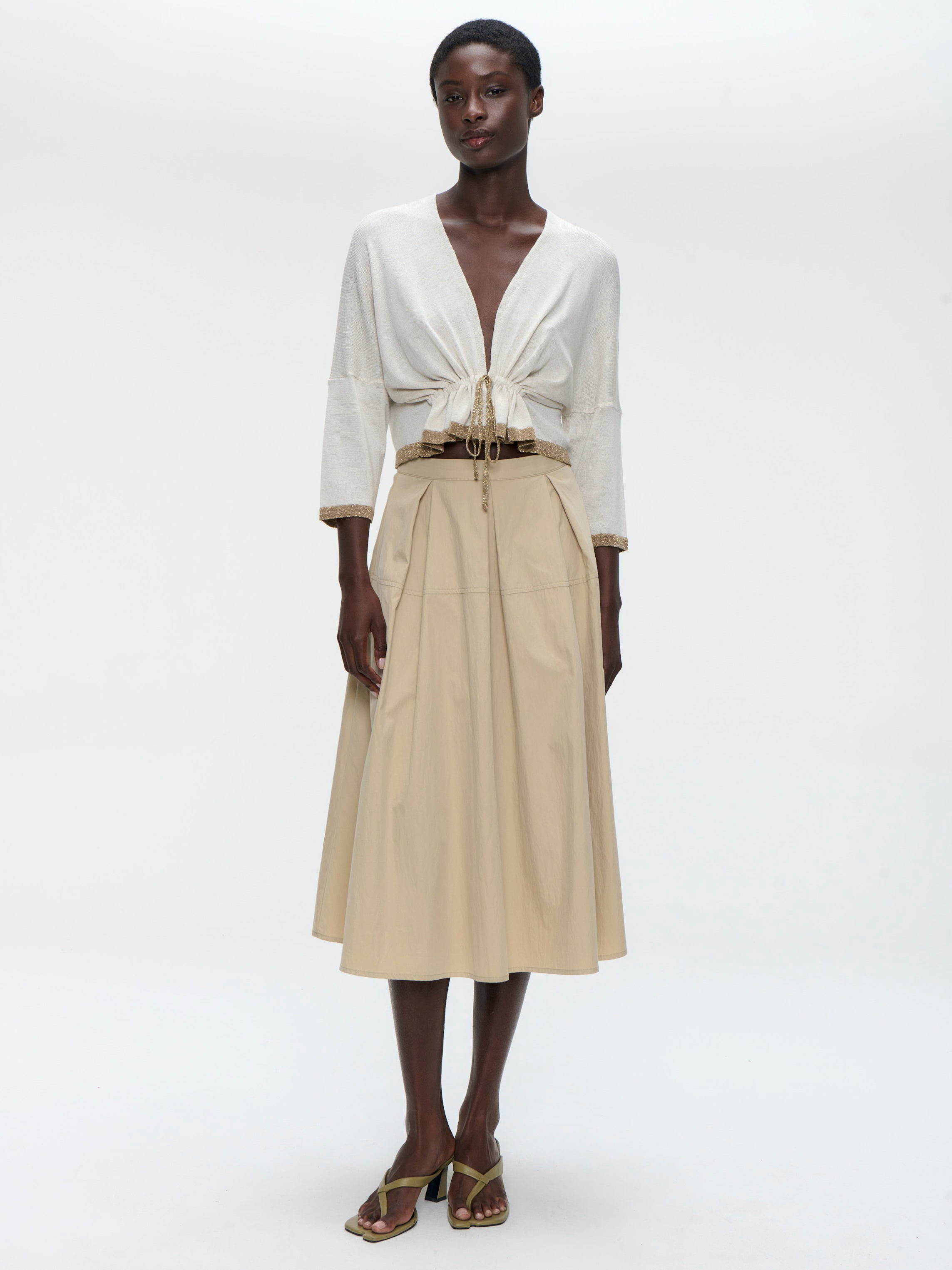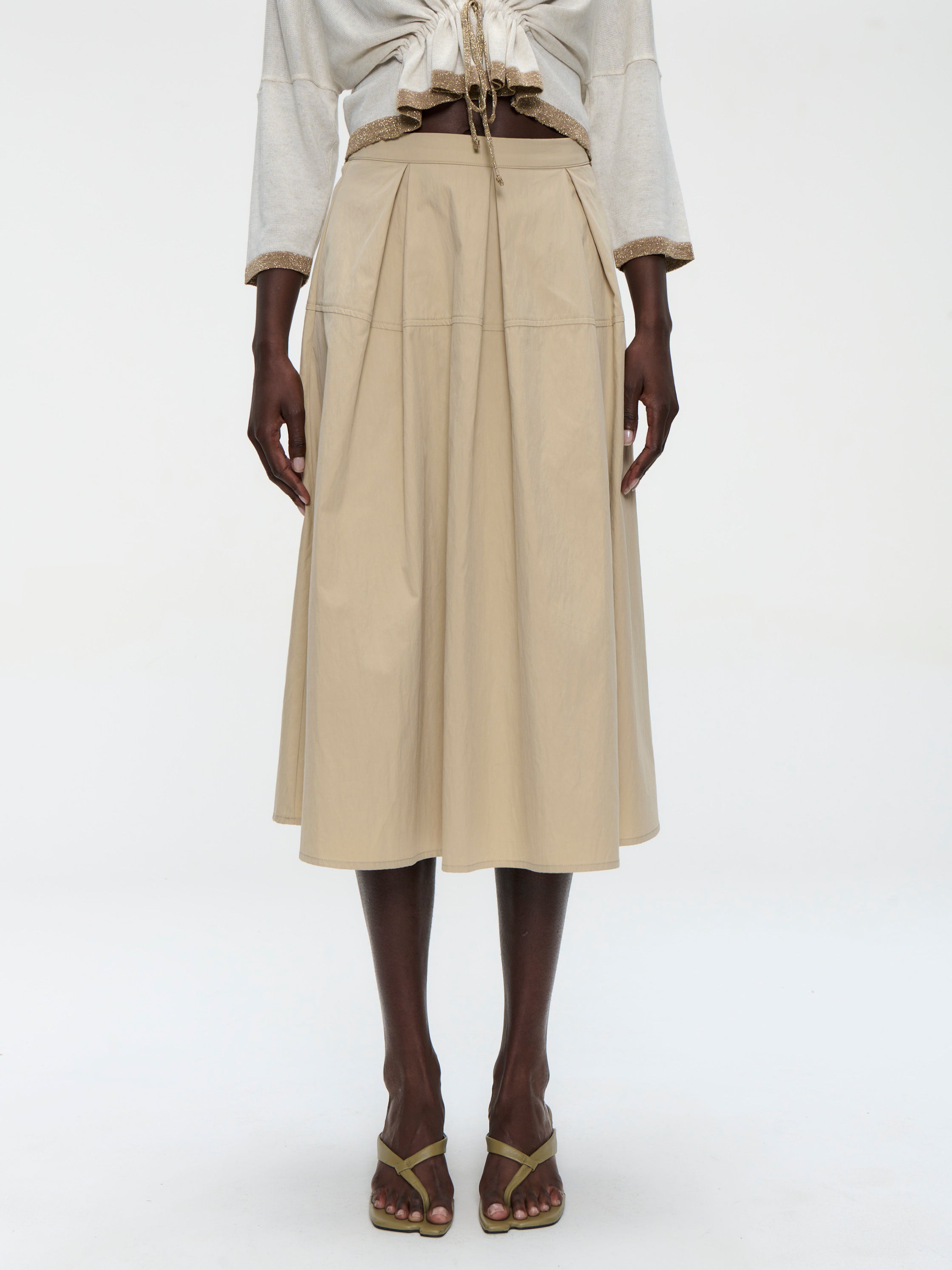 La Rini Poplin Skirt racchiude una semplicità raffinata con una silhouette svasata senza tempo. Realizzata in popeline di cotone con un tocco di poliammide, mantiene perfettamente la forma pur restando leggera e traspirante. La lunghezza midi e le pieghe delicate donano un movimento elegante — perfetta sia per look casual che per occasioni più raffinate.