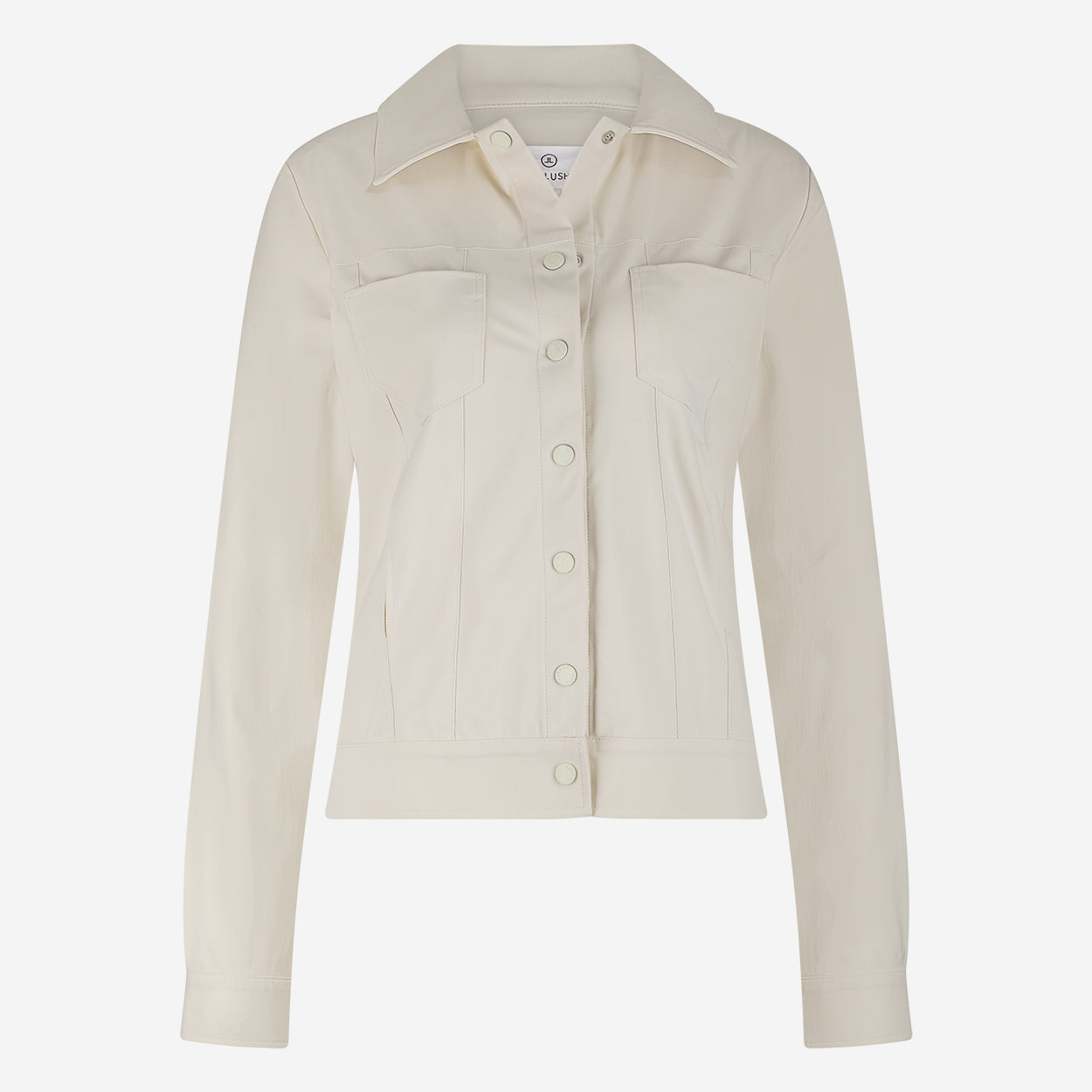 In jersey tecnico spazzolato, con colletto a camicia, bottoni e taschino. Un’alternativa elegante alla classica giacca di jeans.