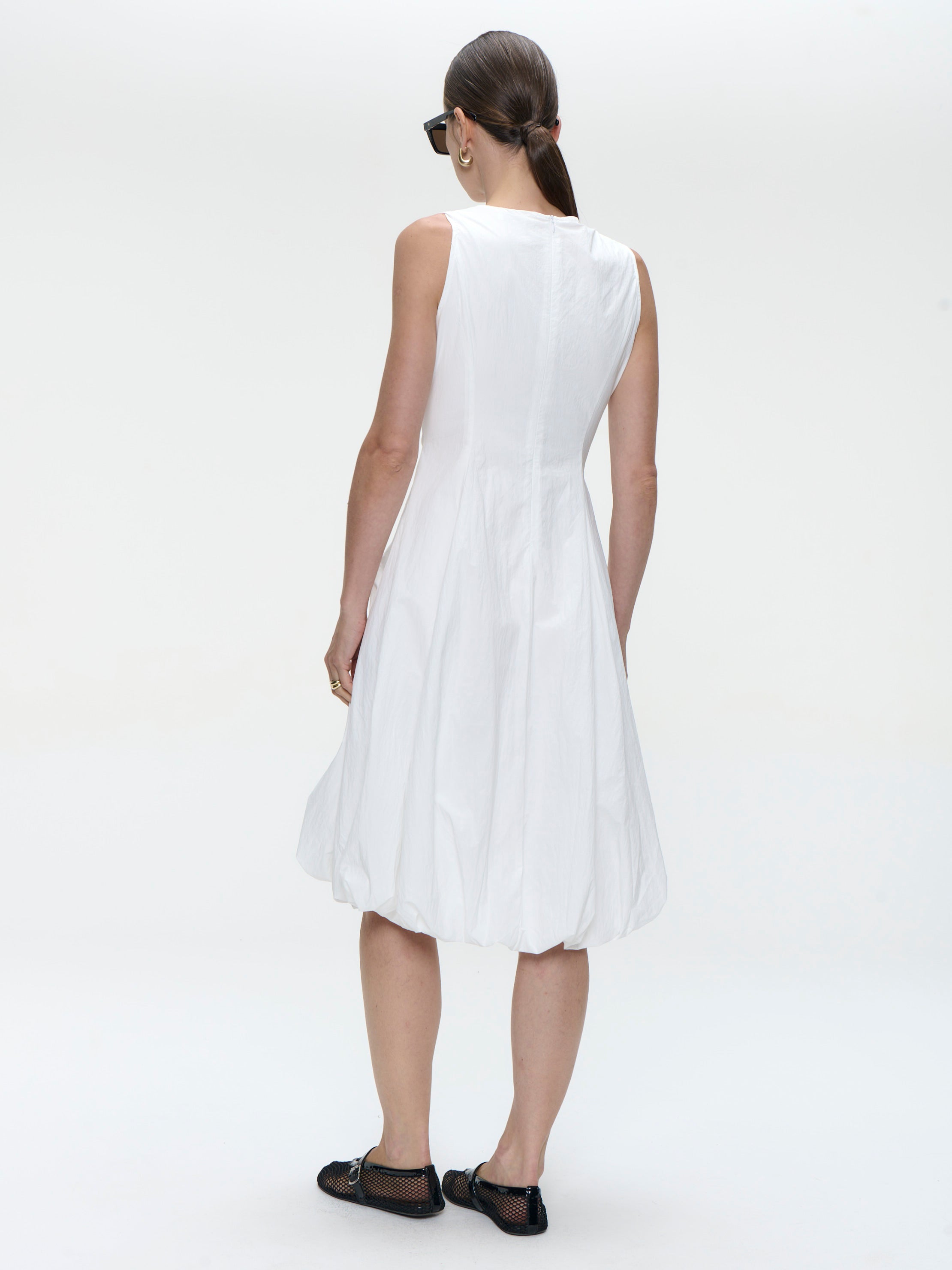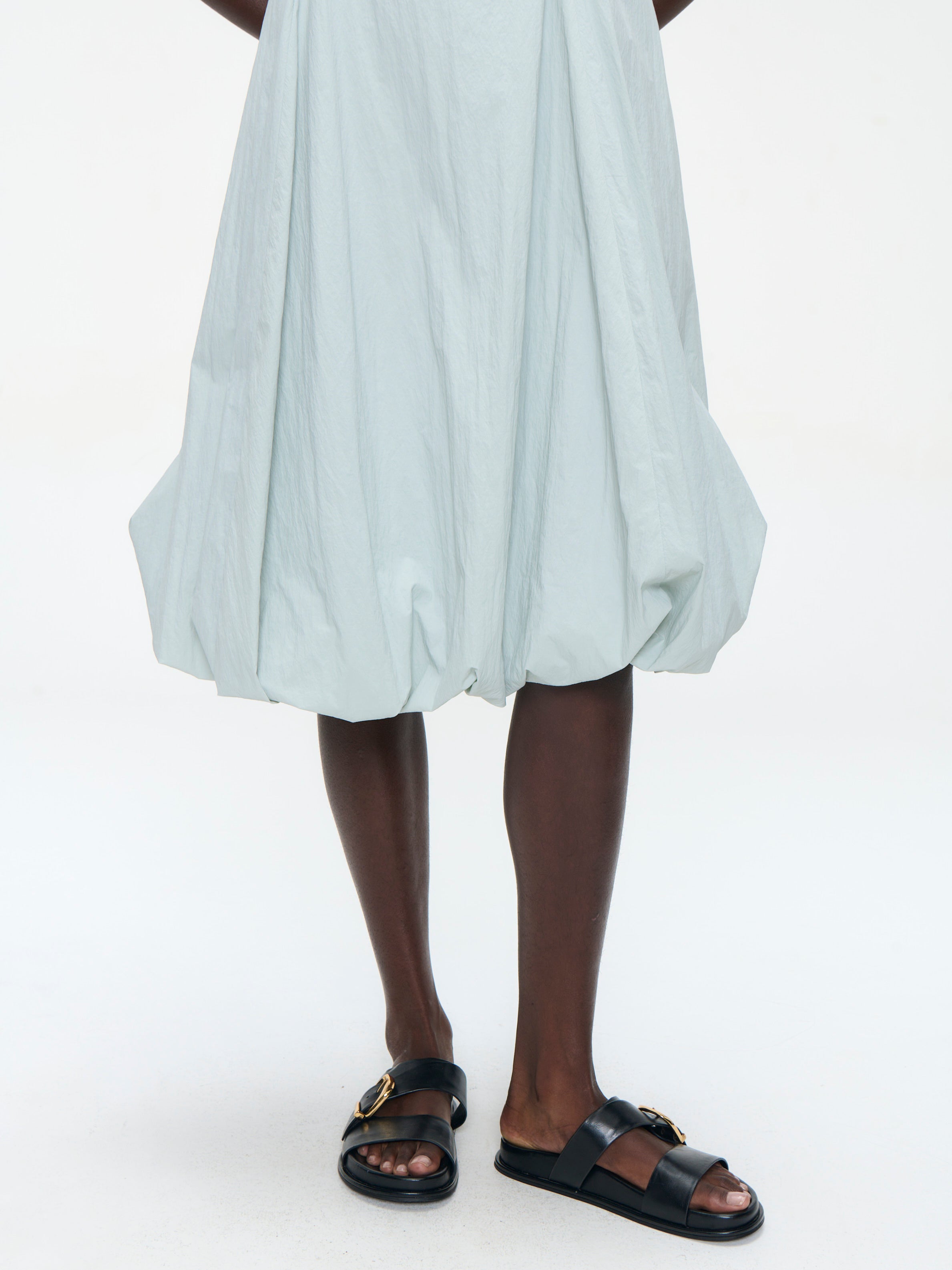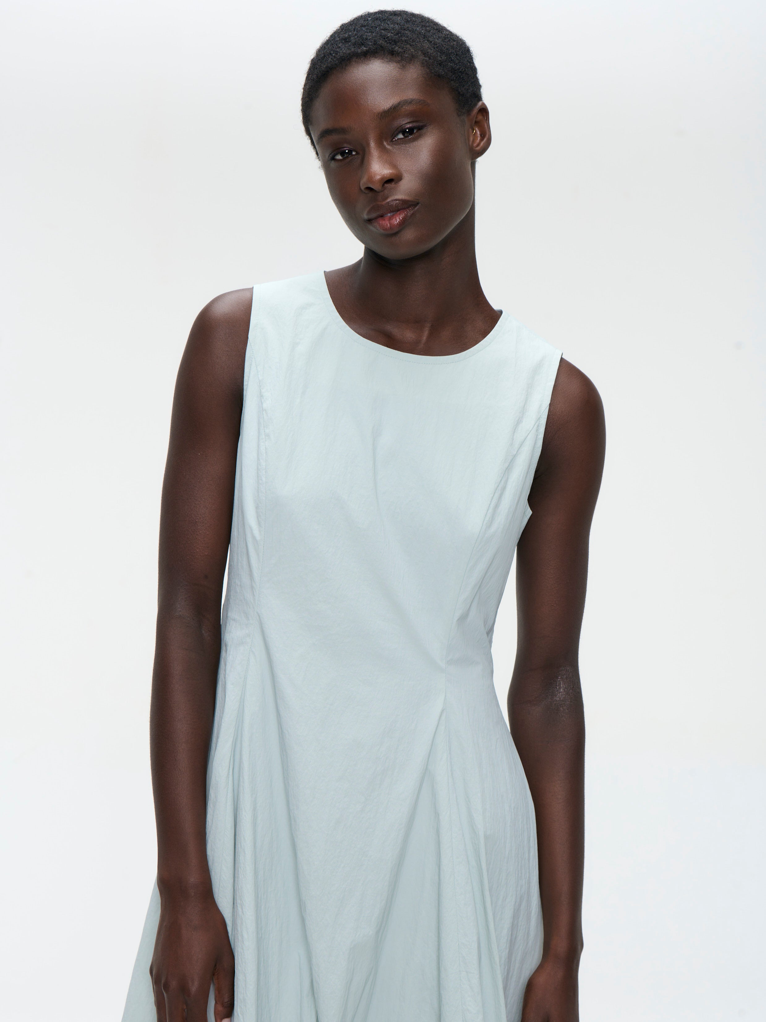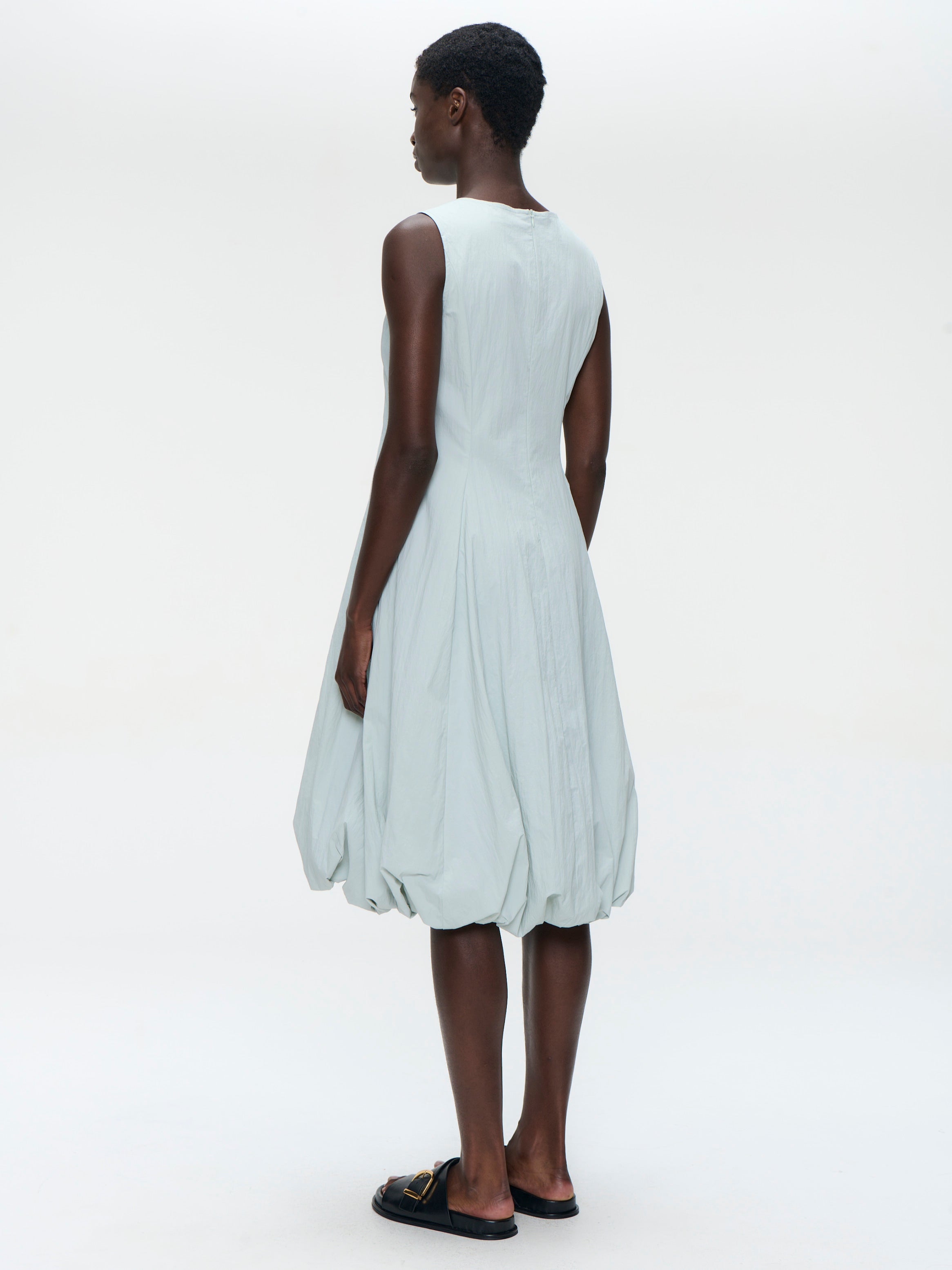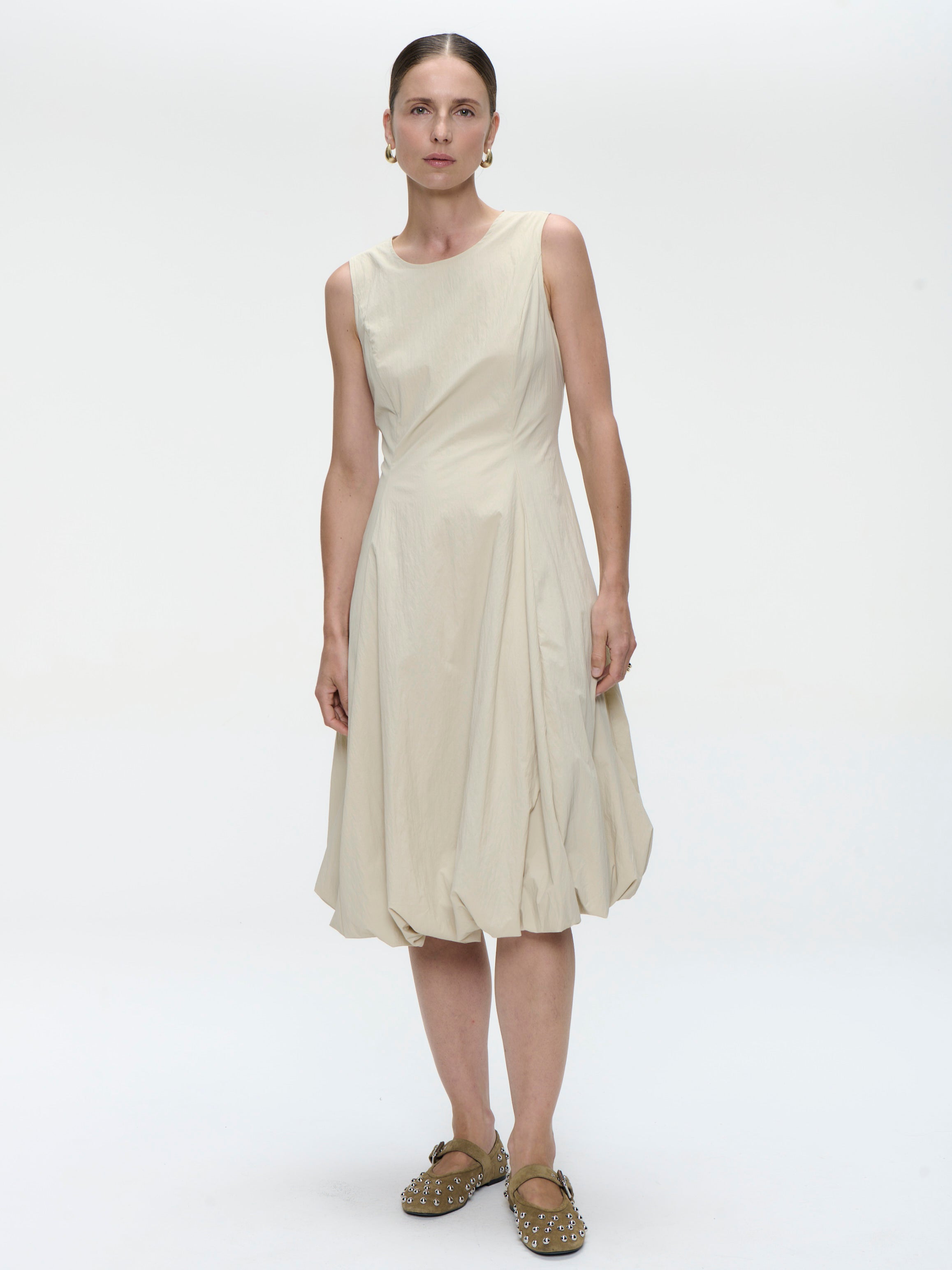 Il Satomi Tafeta Dress di Jane Lushka unisce eleganza sobria e movimento fluido. Realizzato in leggero tessuto taffetà elasticizzato, presenta un taglio senza maniche con drappeggi asimmetrici e orlo delicatamente arricciato. Il tessuto liscio e la lucentezza discreta lo rendono perfetto per ogni occasione.