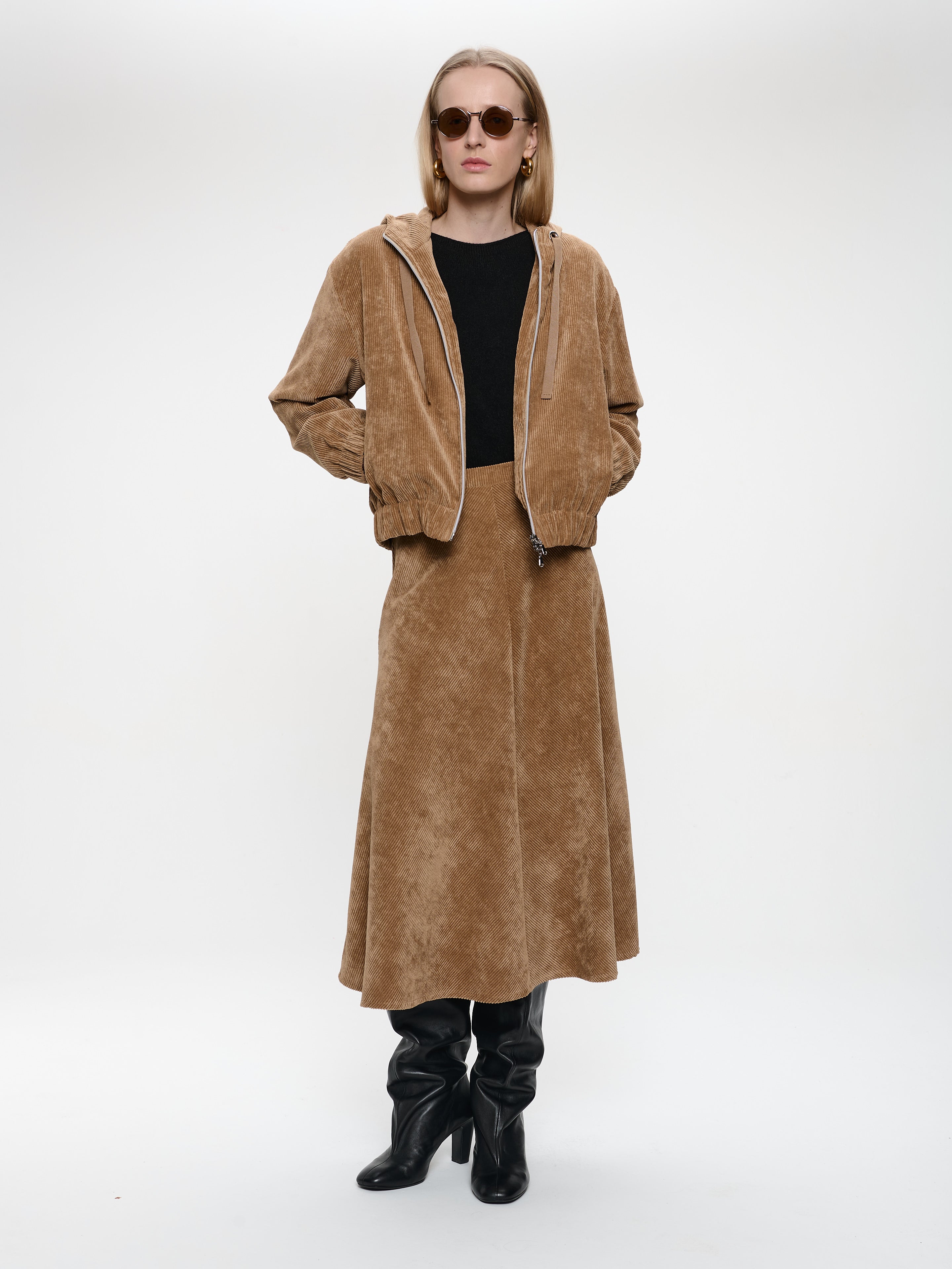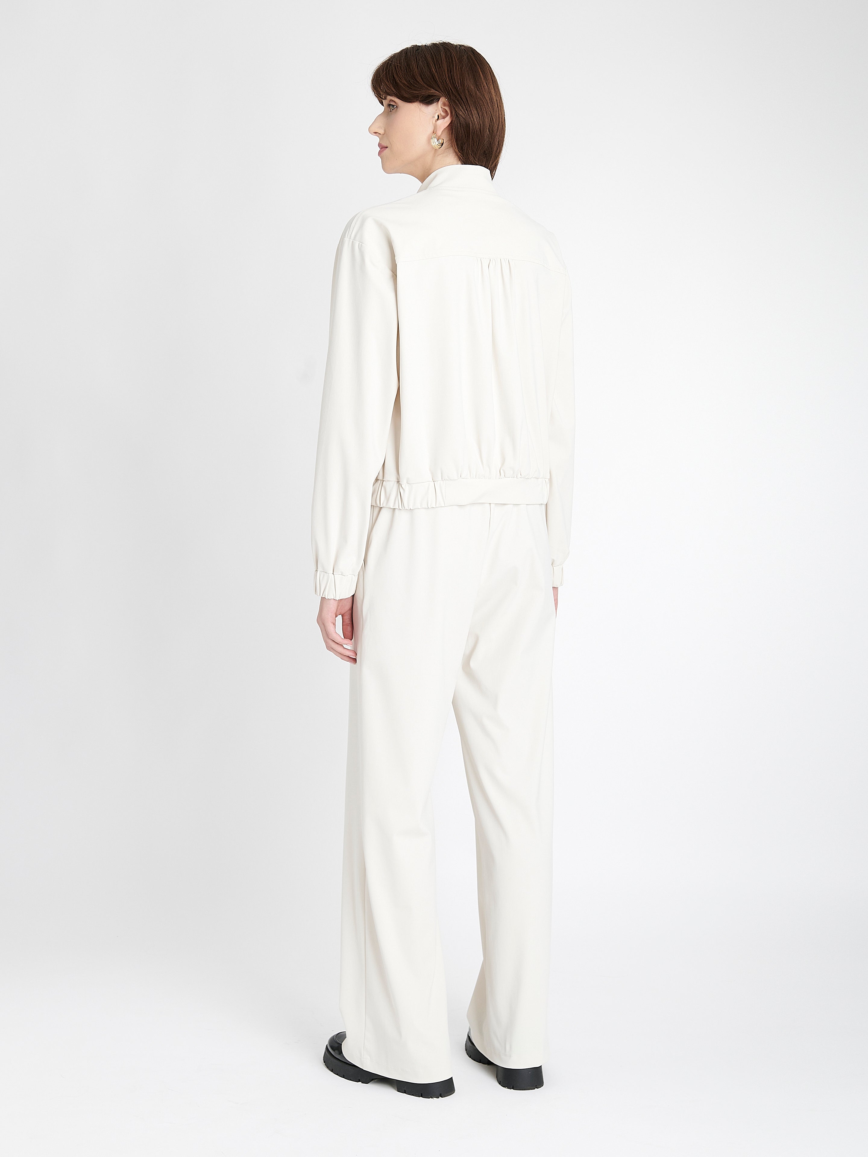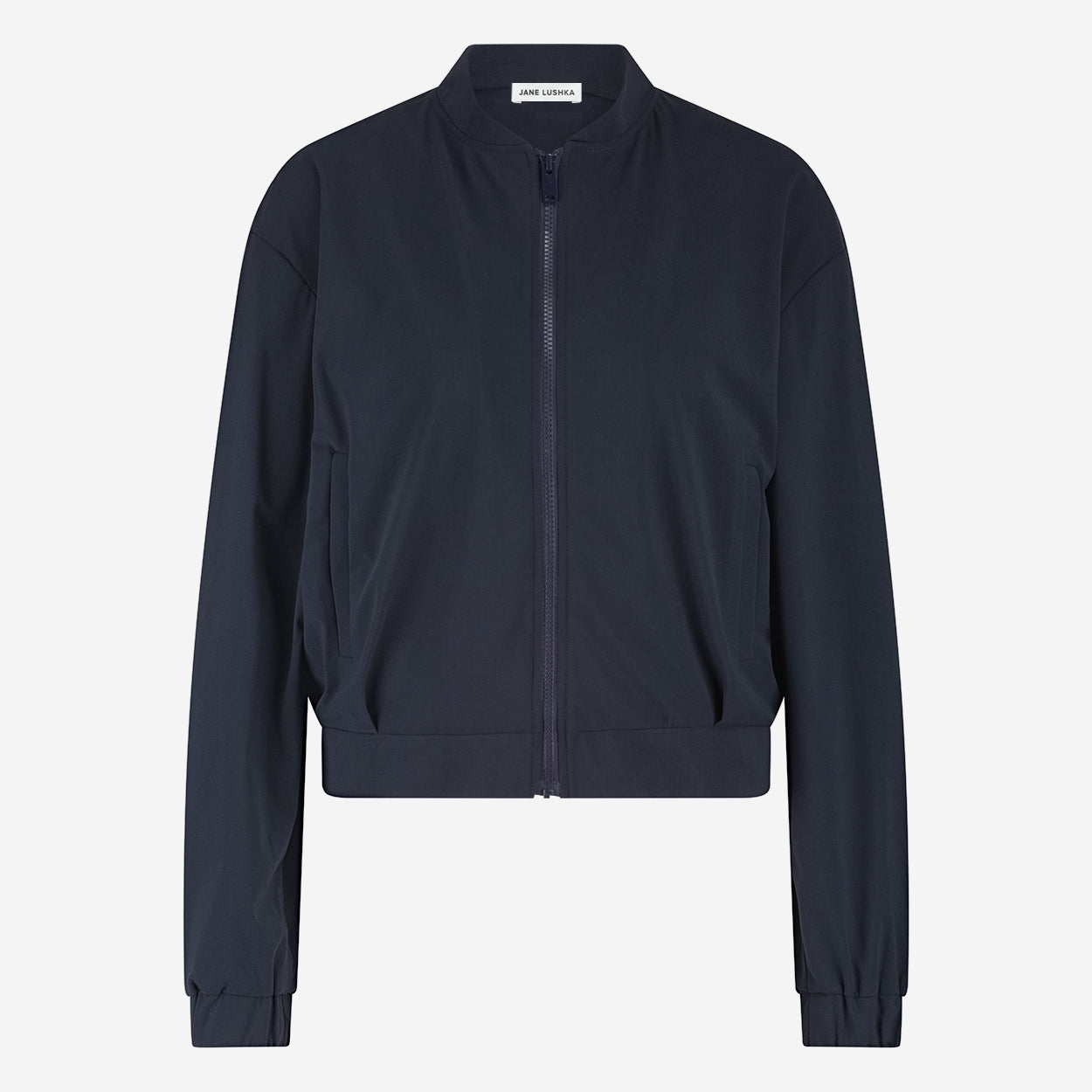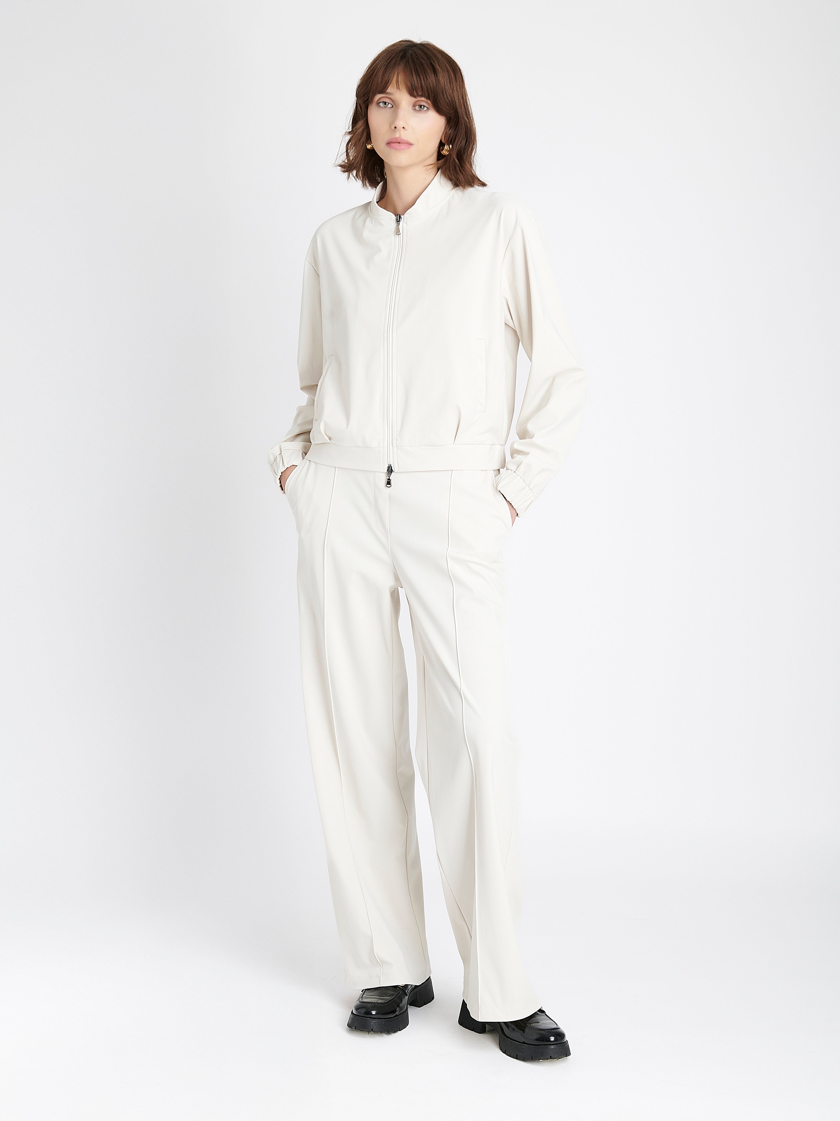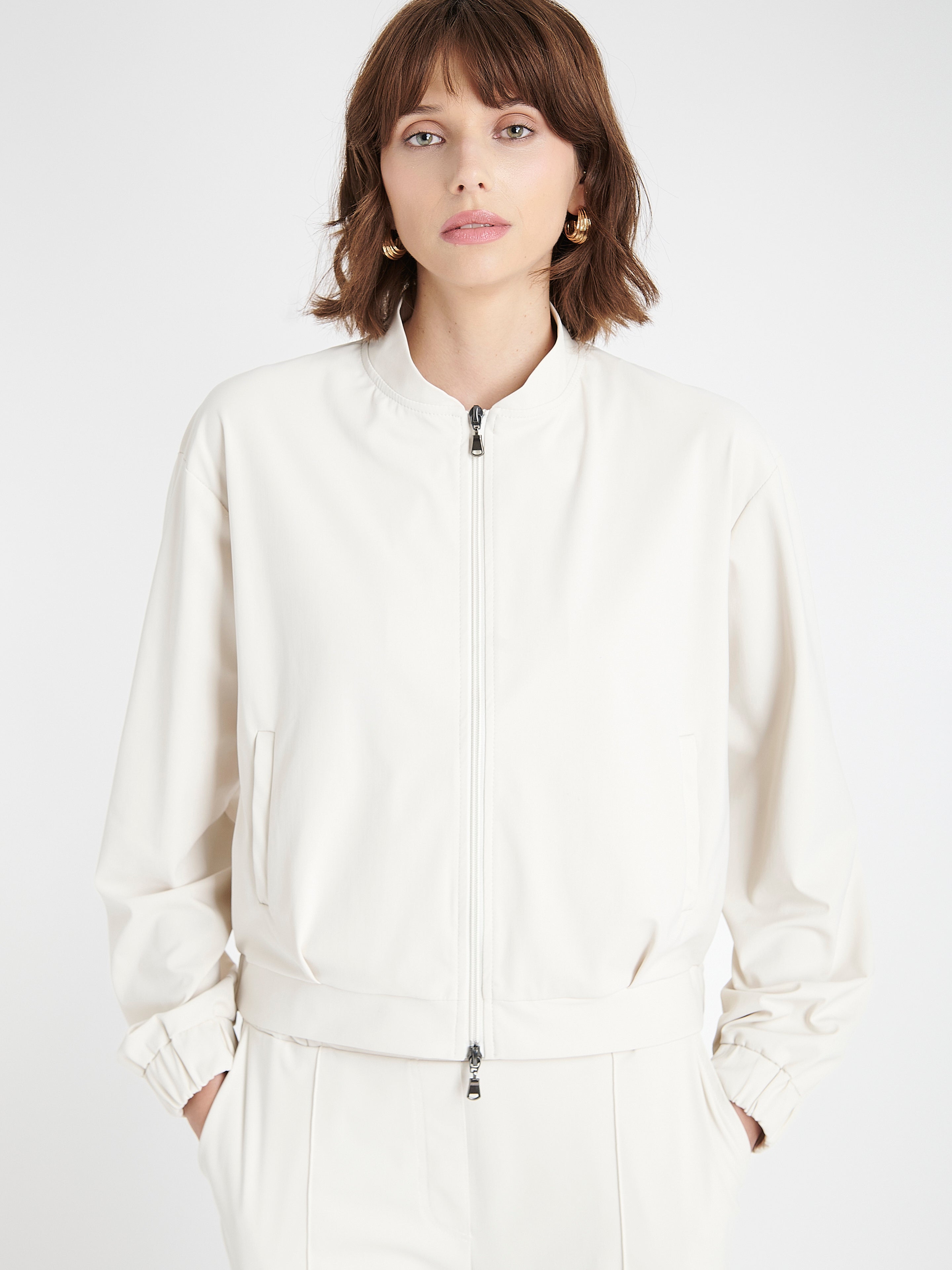 Realizzata in jersey tecnico spazzolato, presenta una superficie morbida e leggermente vellutata, per un effetto lussuoso ma pratico. Il colletto minimal, la zip frontale e i bordi elasticizzati donano una silhouette moderna e pulita. Perfetta con pantaloni coordinati o sopra un abito per uno stile semplice ma sofisticato.