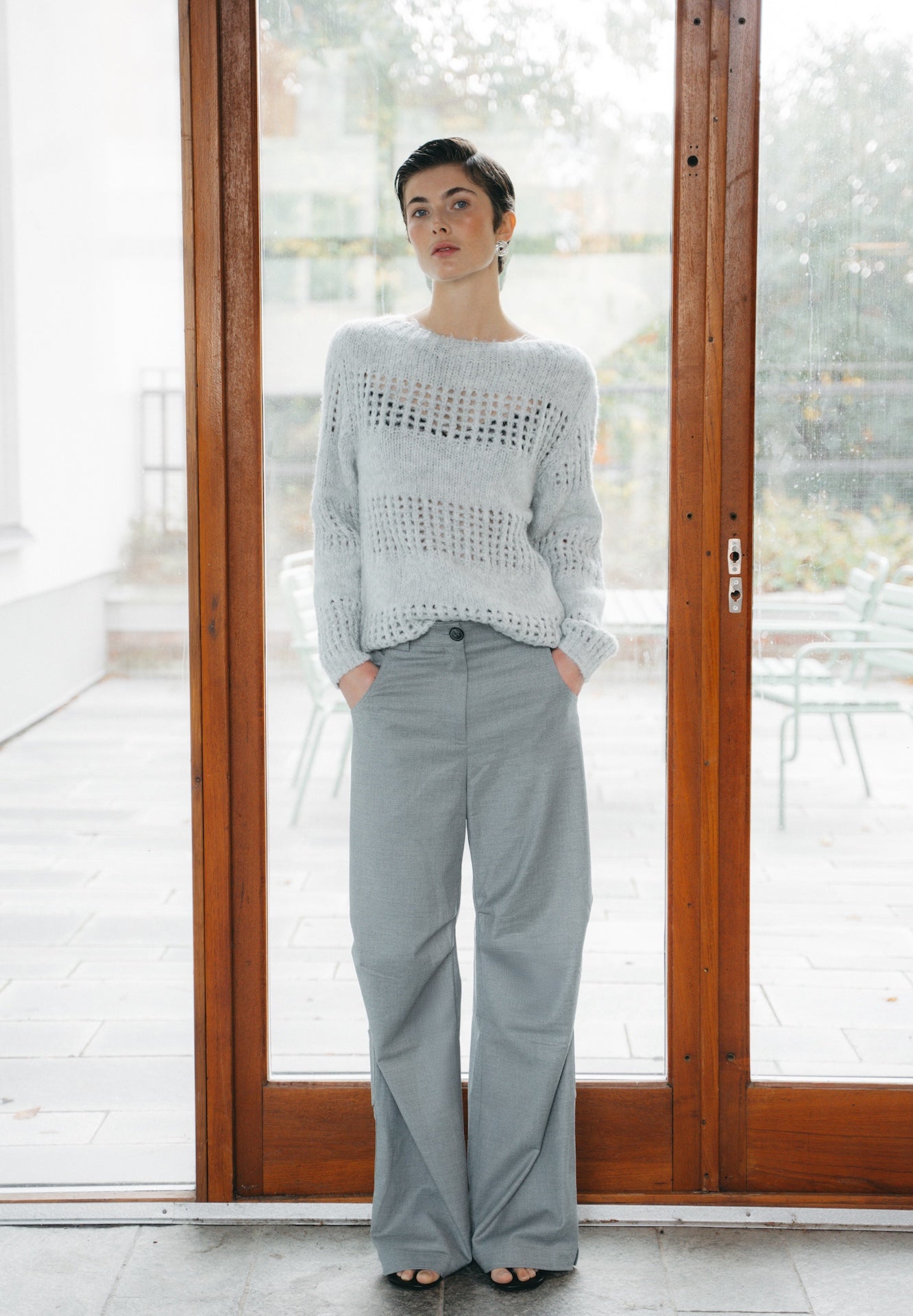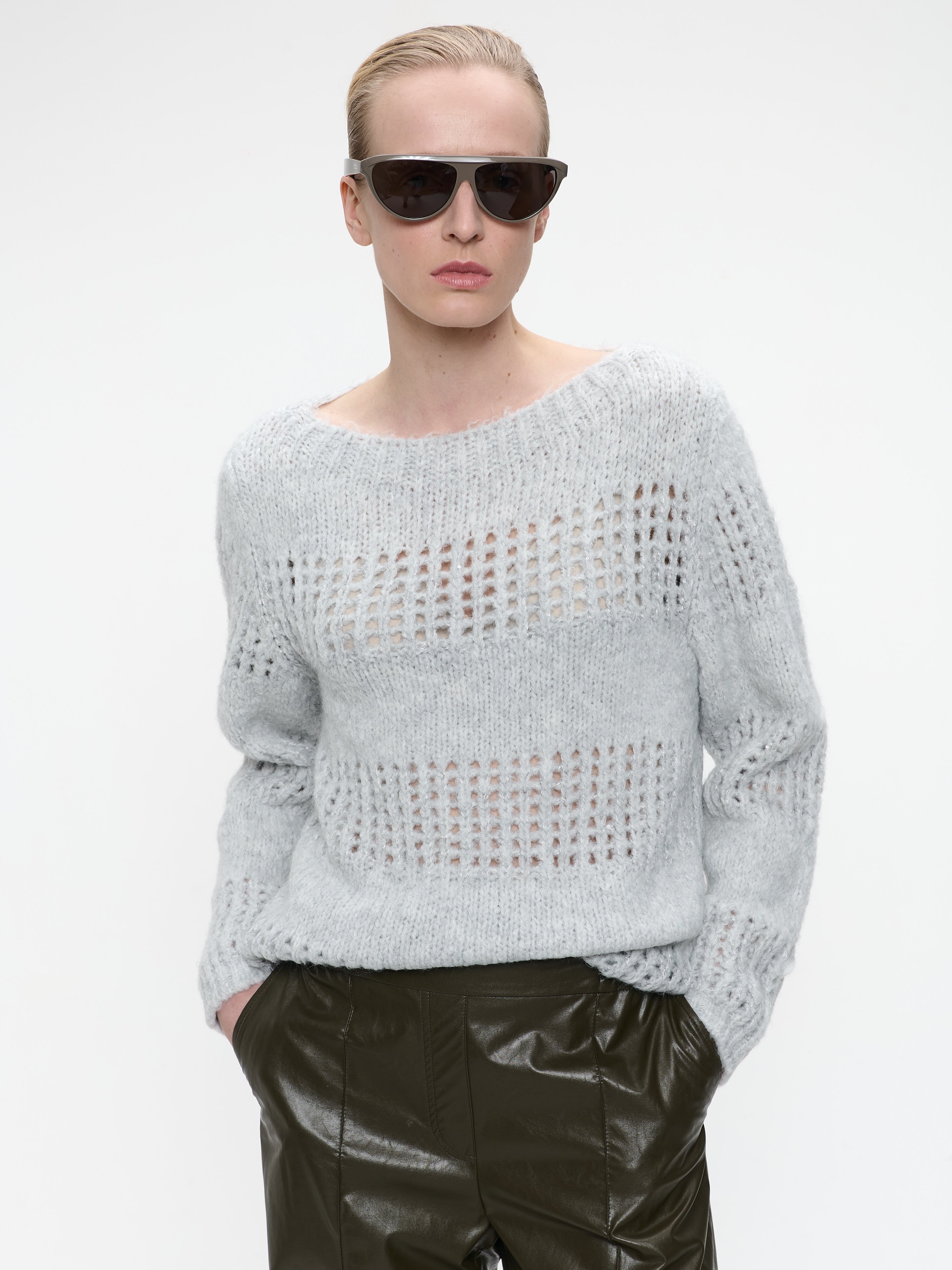 Il pullover Shiny 1034 dà un tocco originale alla maglieria quotidiana con la sua struttura a maglia aperta semi-trasparente e filati leggermente brillanti.