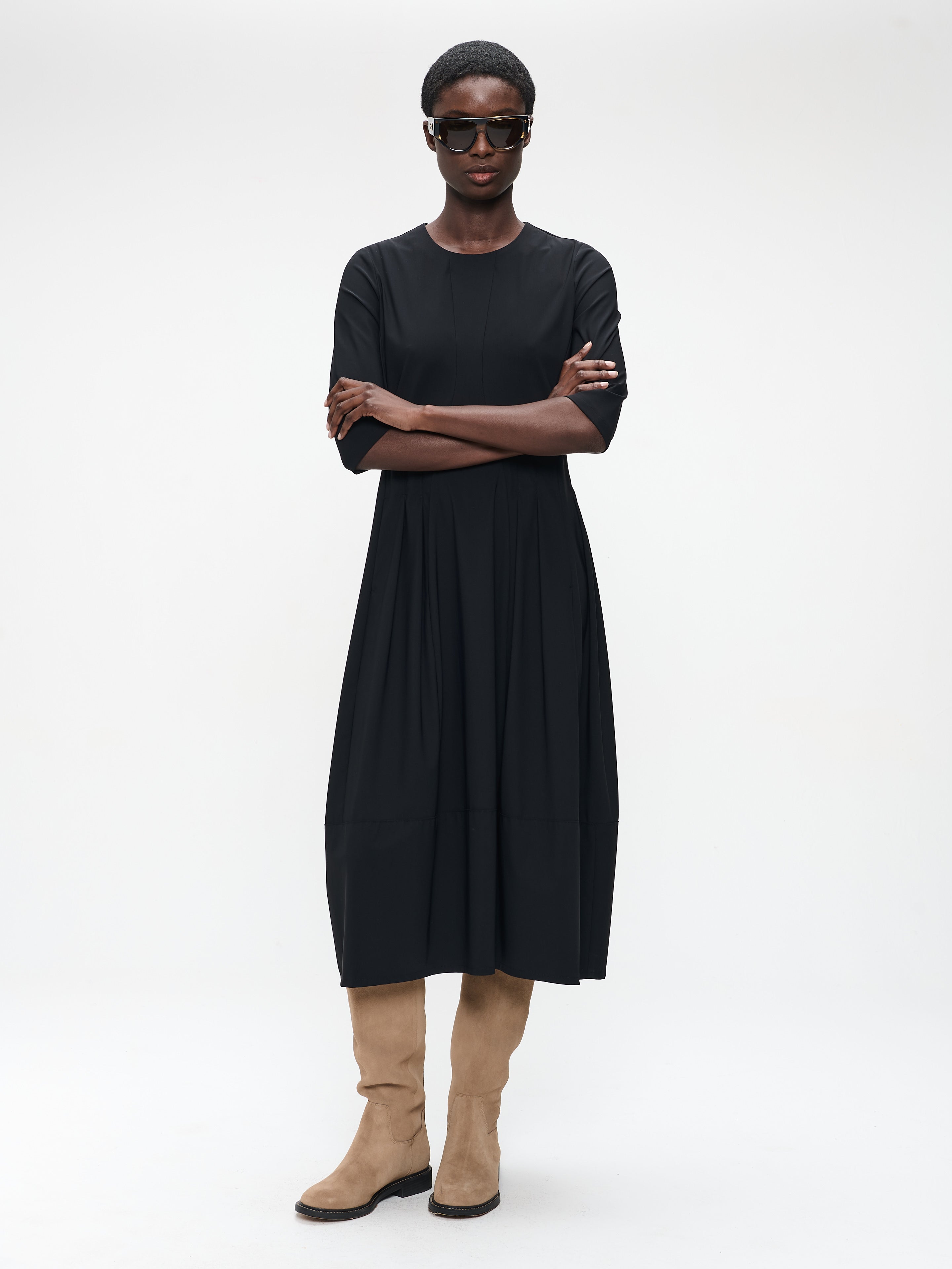 Une version raffinée du confort quotidien, la robe Heide LS est confectionnée en jersey technique doux pour une coupe lisse et structurée. Sa silhouette décontractée en A tombe sous le genou, avec des poches latérales discrètes ajoutant de la fonctionnalité. Le col rond et les manches 3/4 gardent un look soigné mais décontracté — idéale pour le travail comme le week-end.